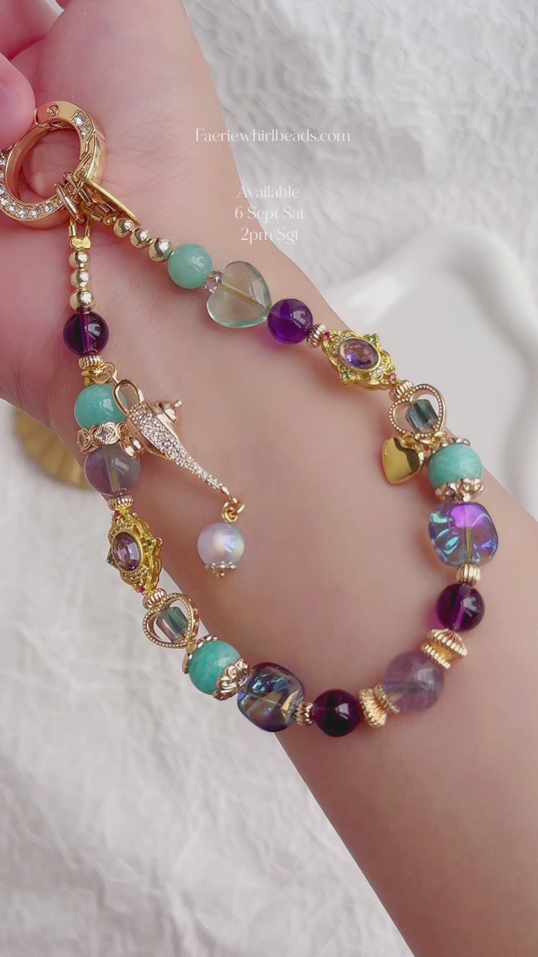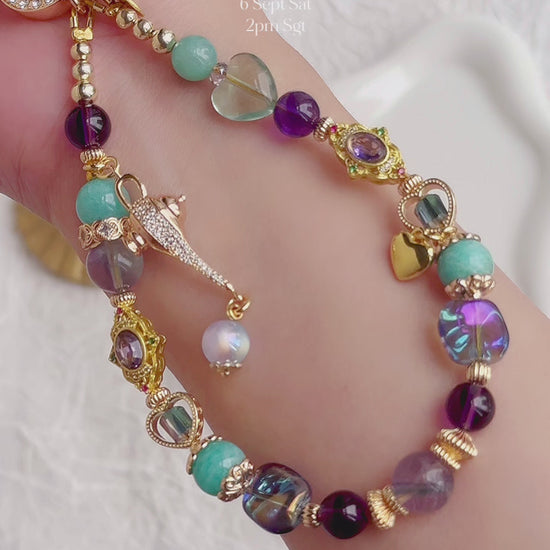 Inspired by the enchanting world of Aladdin and Jasmine, this crystal mobile charm features a mesmerizing trio of Amazonite, Uruguay Amethyst, and Purple-Green Fluorite, woven together in the rich, royal tones of the beloved characters. A gold-plated genie lamp dangles gracefully, evoking the wonder of hidden wishes and magical journeys.