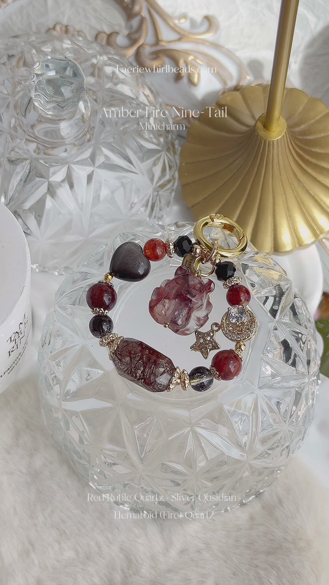Designed with Red Rutile Quartz, Hematoid (Fire) Quartz, and Silver Obsidian, the Amber Fire Nine-Tail embodies fiery transformation, intuition, and protective energy. At its center rests a beautifully carved nine-tailed fox in Hematoid Quartz, a mythical symbol of wisdom, charm, manifestation, and powerful spiritual protection. In folklore, the nine-tailed fox is believed to enhance intuition, amplify one’s charisma, and attract good fortune while warding off negativity.