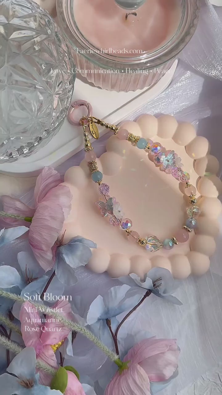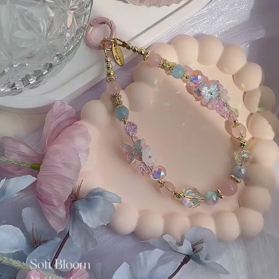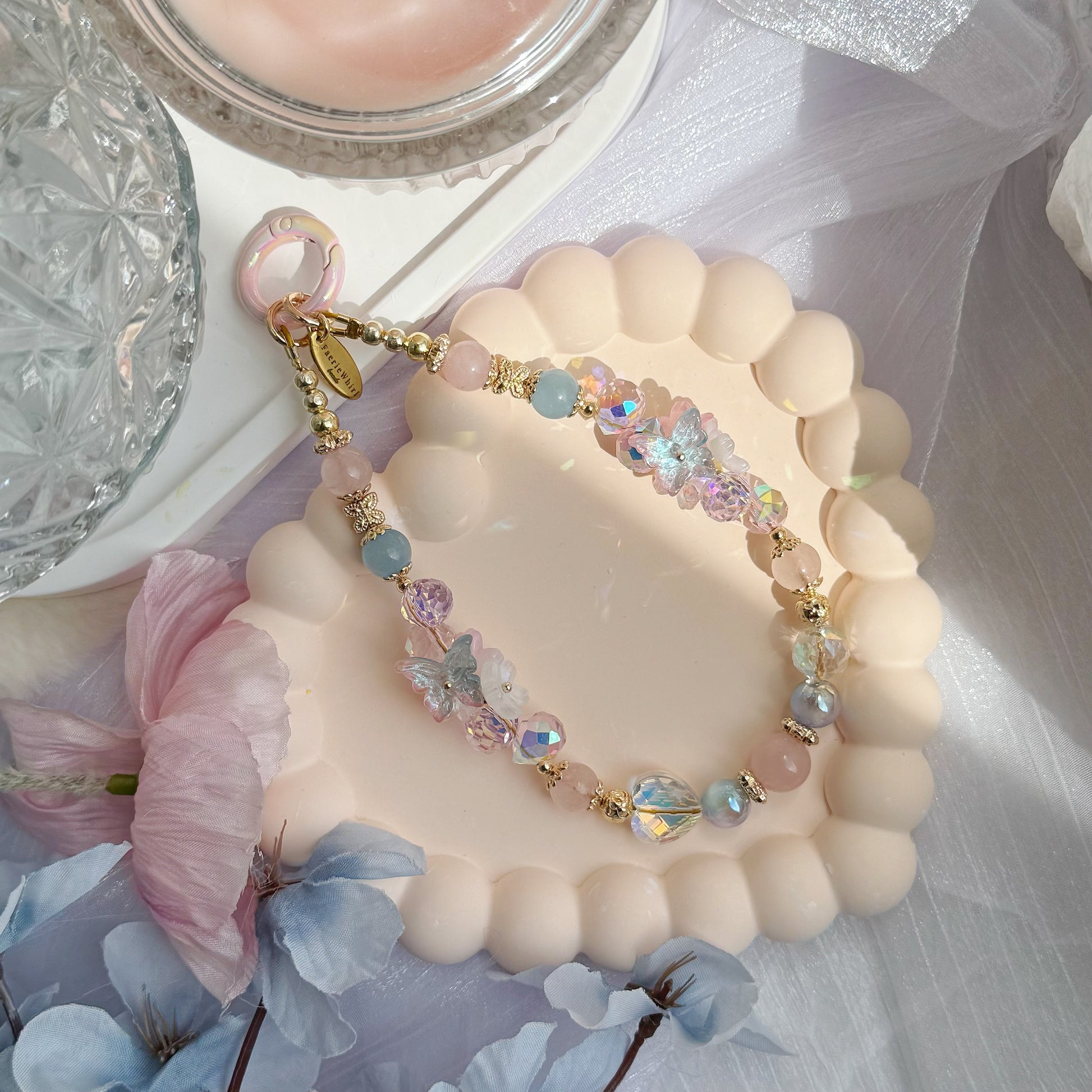 Sweet and delicate, the “Soft Bloom” crystal mobile charm captures the gentle beauty of spring in soft cotton candy hues of blue and pink. Handcrafted with Aquamarine and Rose Quartz, and accented with shimmering butterfly and flower charms, this lightweight piece radiates a calm, loving energy, perfect for bringing serenity and warmth to your everyday style.