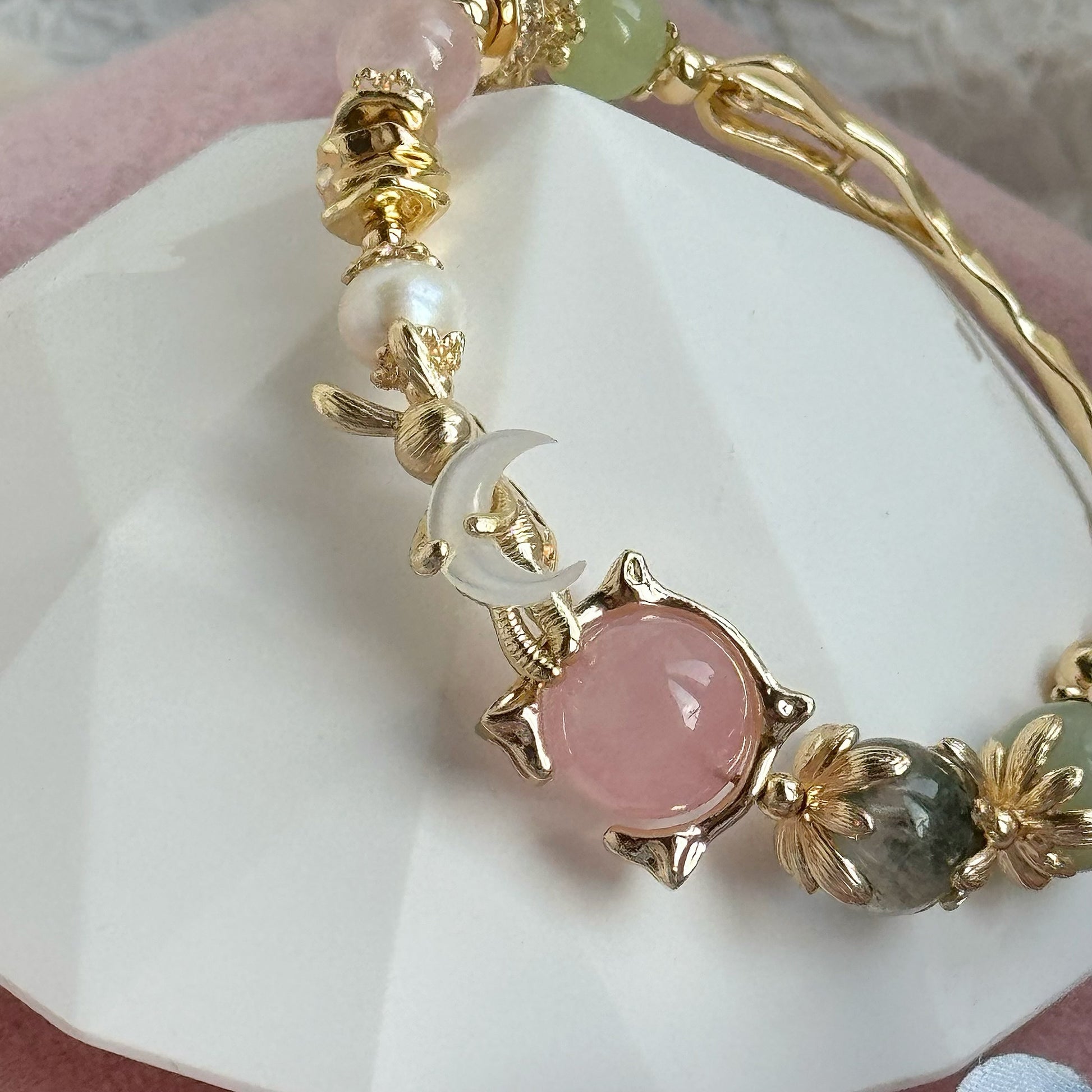 Bunny Eclipse in Rose Quartz, Green Phantom Quartz, Green Chalcedony, Freshwater Pearl, Mother of Pearl [WS: 14cm or 15cm]