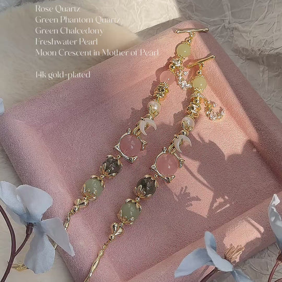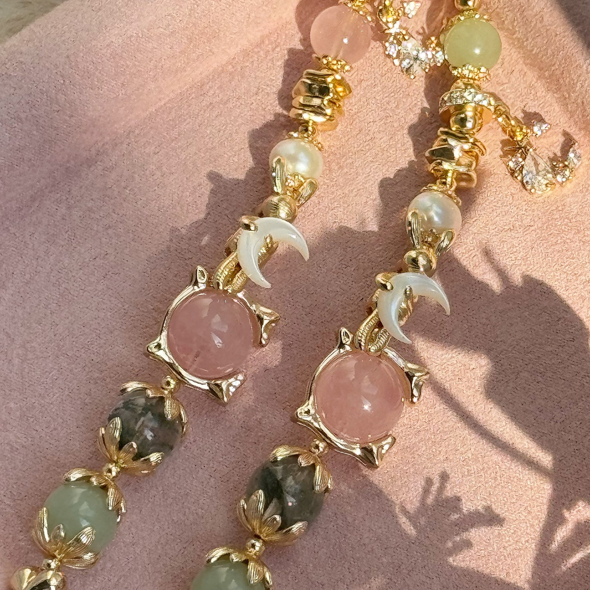 in Rose Quartz, Green Phantom Quartz, Green Chalcedony, Freshwater Pearl, Mother of Pearl Moon Crescent & 14k gold-plated hardware.