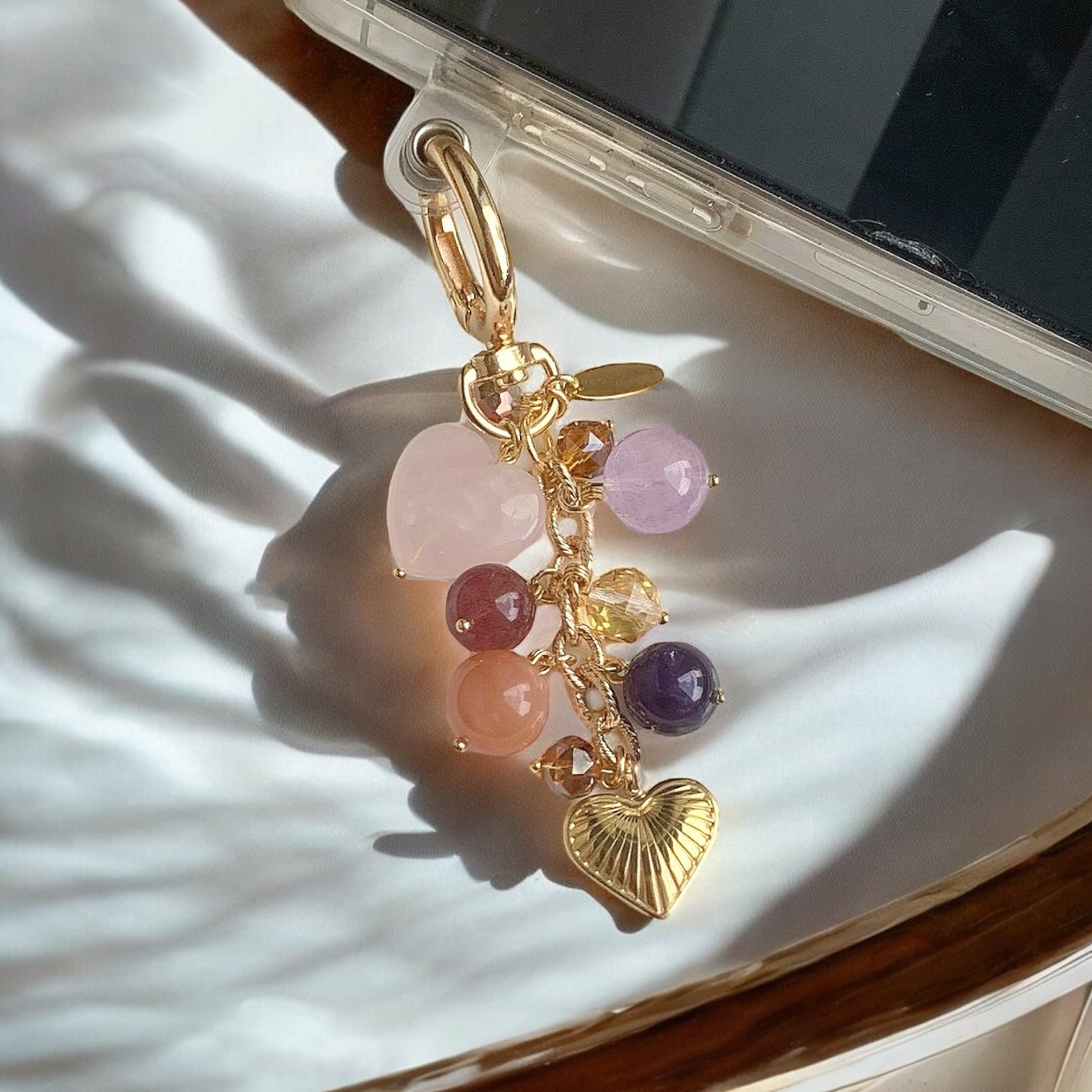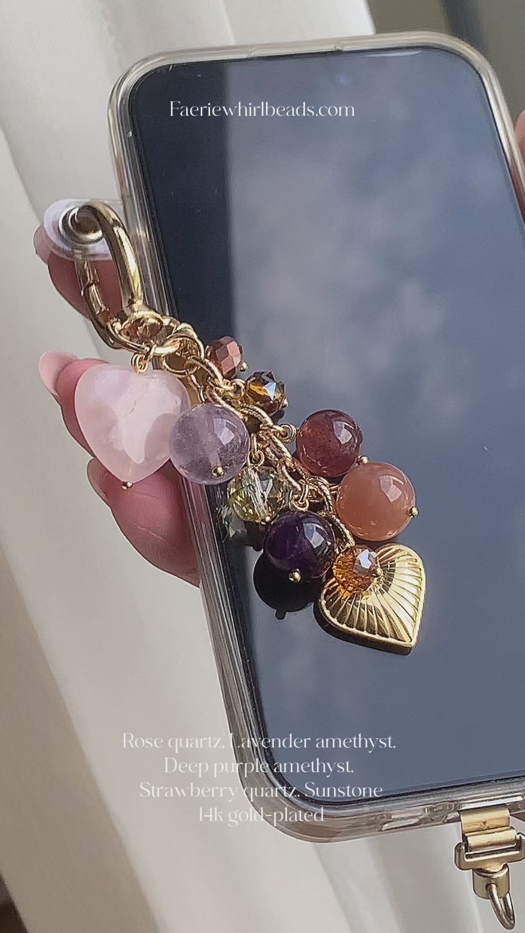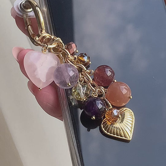 This delicate crystal minicharm features dangling stones including heart-shaped rose quartz, lavender and deep purple amethyst, sunstone, and strawberry quartz, accented with sparkling iridescent acrylic crystals. Finished with a 14k gold-plated heart-shaped charm, it’s the perfect mini accessory for those seeking beauty with powerful healing energy.