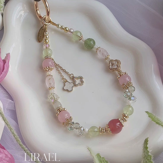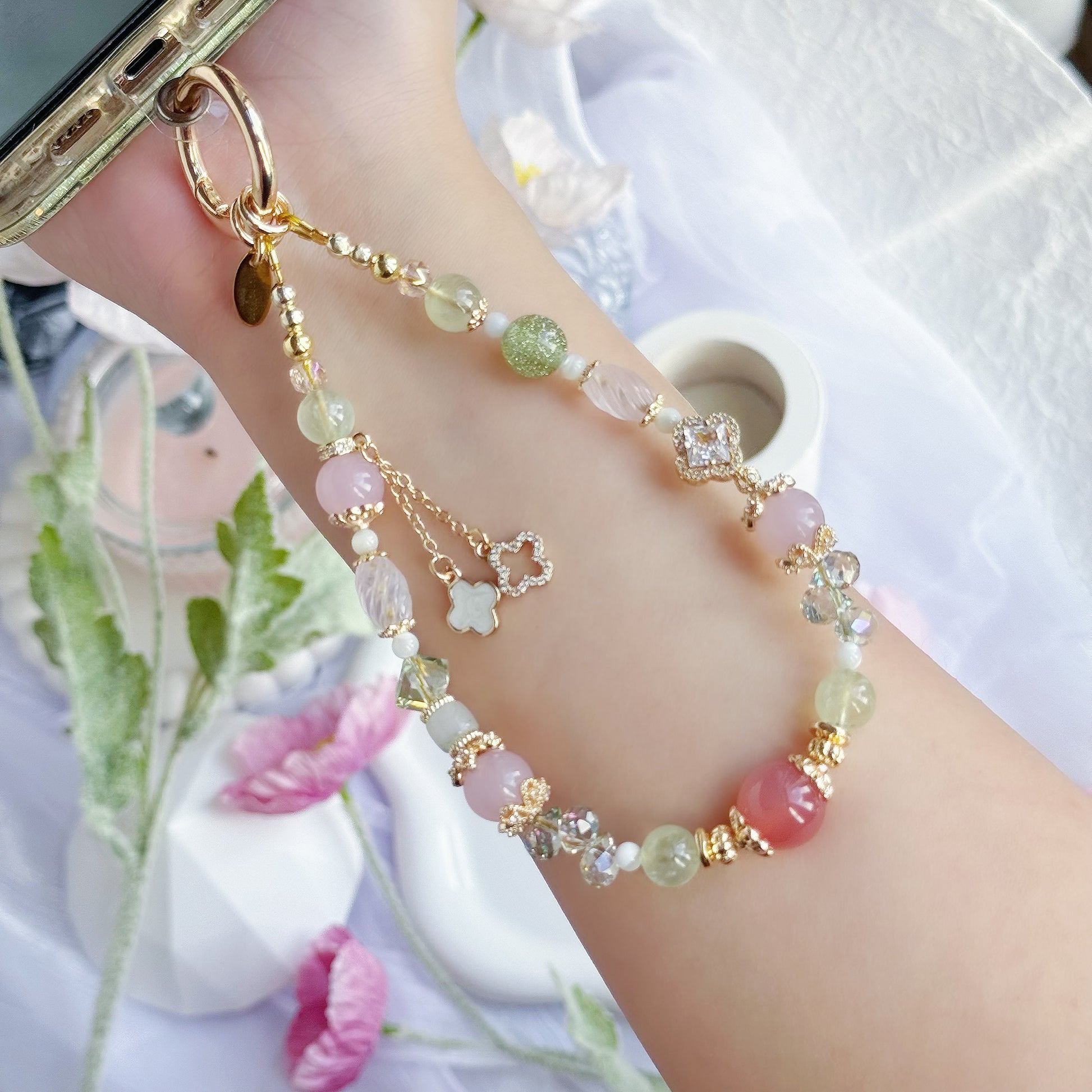 A delicate fusion of soft pastel tones, this mobile charm features Yan Yuan Agate, Rose Quartz, Prehnite, and Green Aventurine, beautifully complemented by white Trochus shell beads, 14k gold-plated hardware, and charming clover charms for a subtle touch of whimsy and luck.
