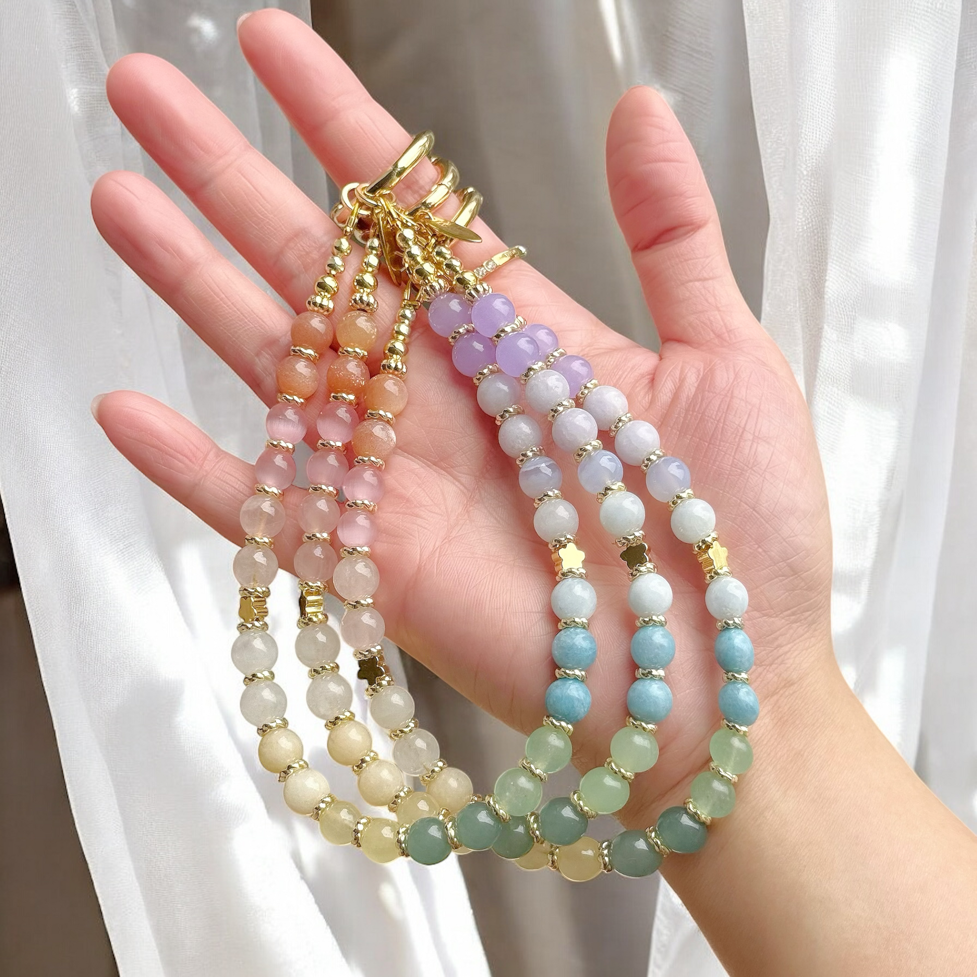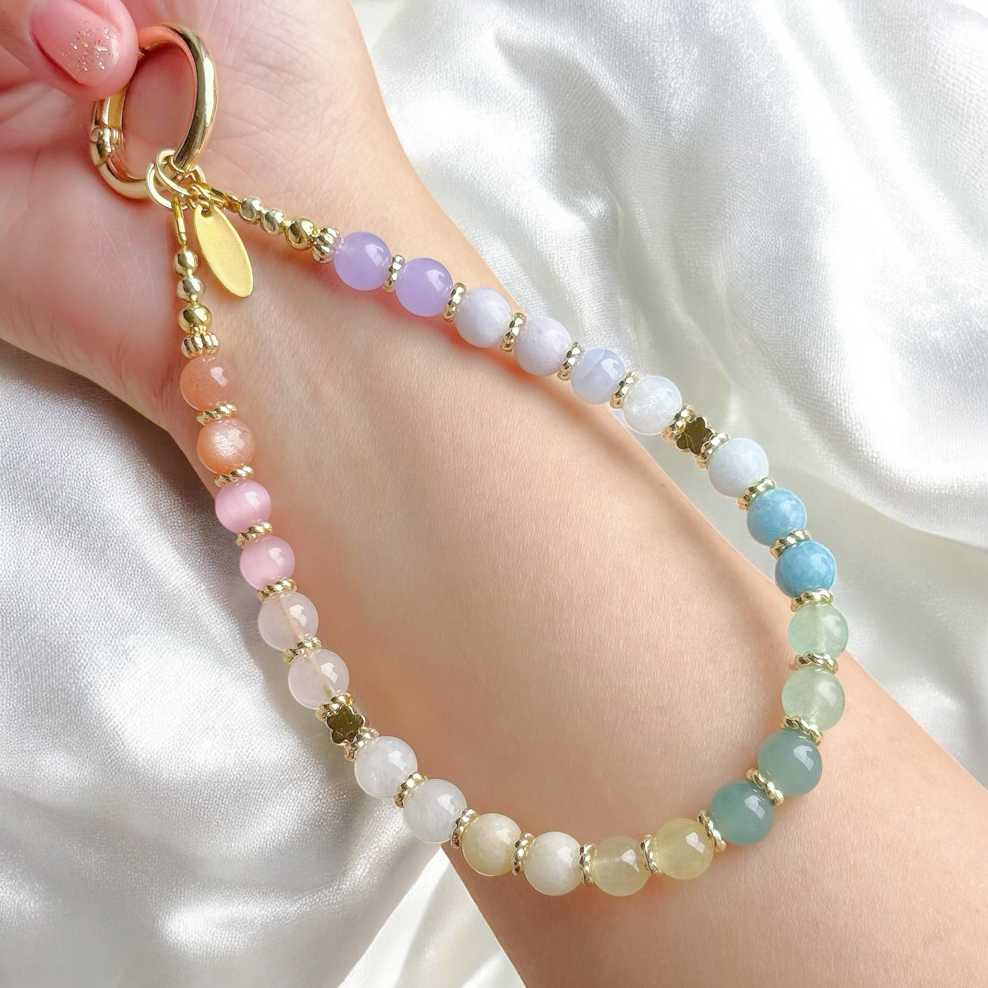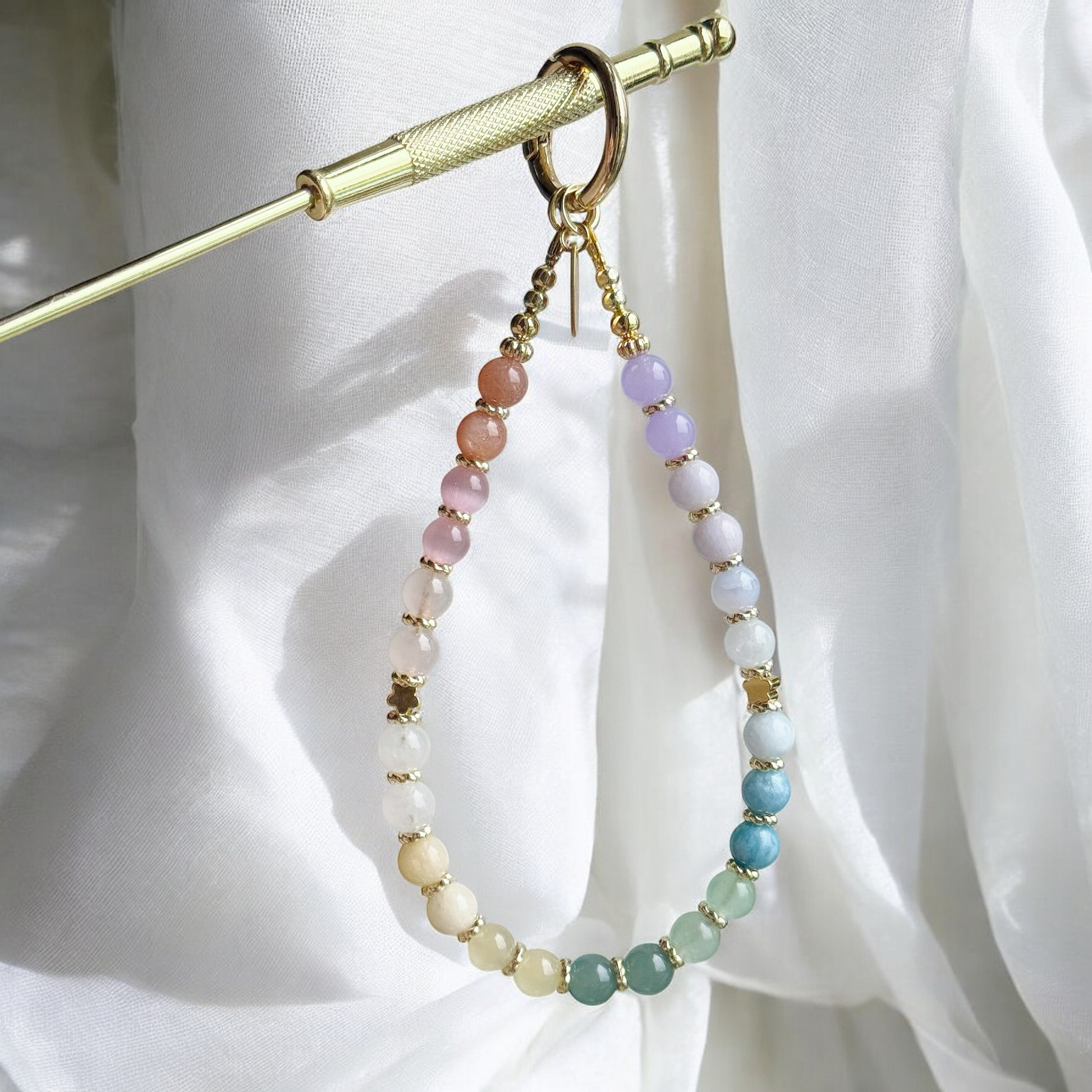 Each crystal is chosen not just for its delicate beauty, but for its harmonious energy. Together, they form a powerful blend that promotes emotional balance, positivity, and inner peace. Rose Quartz and Morganite foster love and compassion, while Sunstone and Yellow Calcite uplift the spirit. Aquamarine and Blue Aventurine soothe the mind, and White Jade enhances clarity. The blend of Chalcedonies supports communication and emotional healing, creating a charm that’s both visually delightful and energetically balanced—perfect for daily inspiration and calm.
