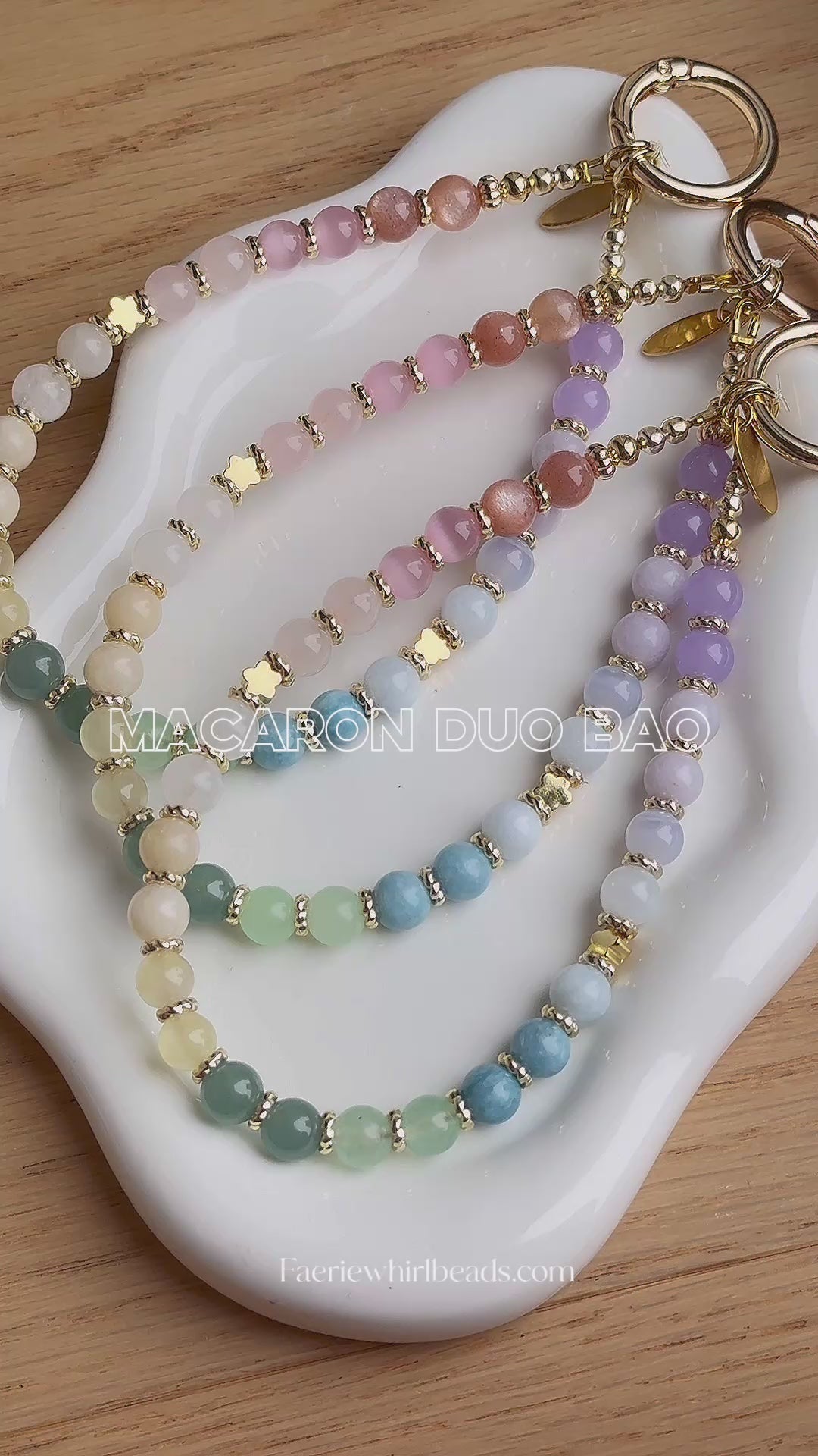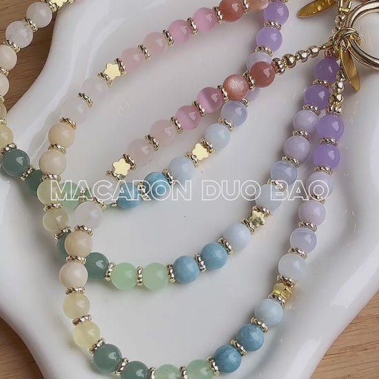 Sweet and colourful, this enchanting crystal mobile charm features a dreamy array of pastel-hued crystals inspired by macaron shades, beautifully accented with 18k gold-plated hardware. It includes Sunstone, Pink Cat's Eye, Rose Quartz, White Jade, Yellow Calcite, Yellow Chalcedony, Blue Aventurine, Aquamarine, Morganite, and Purple Chalcedony.