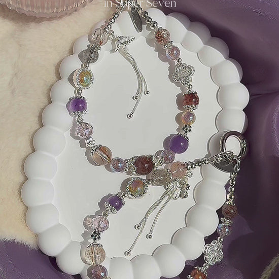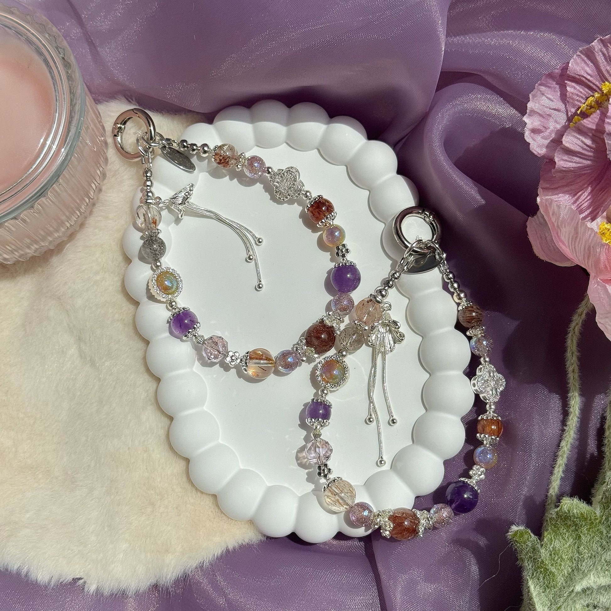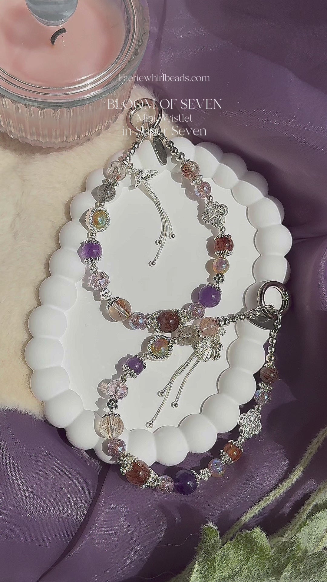 Bloom of Seven is a mini wristlet that blends gentle elegance with powerful energy. Crafted with radiant Super Seven crystals, silver-plated hardware, a bellflower dangle, and a sparkling clover zircon charm, it symbolizes growth, luck, and harmony in every detail.
