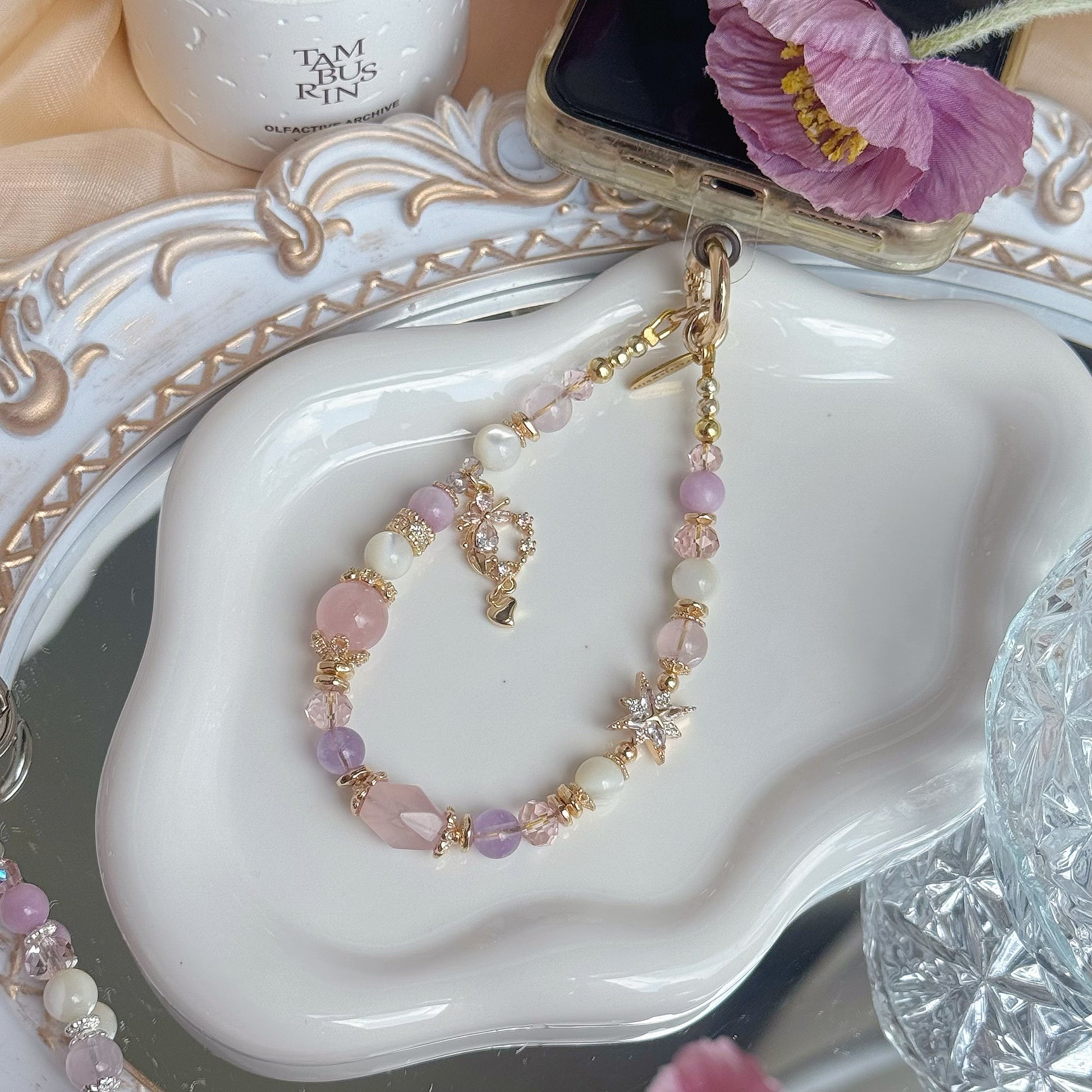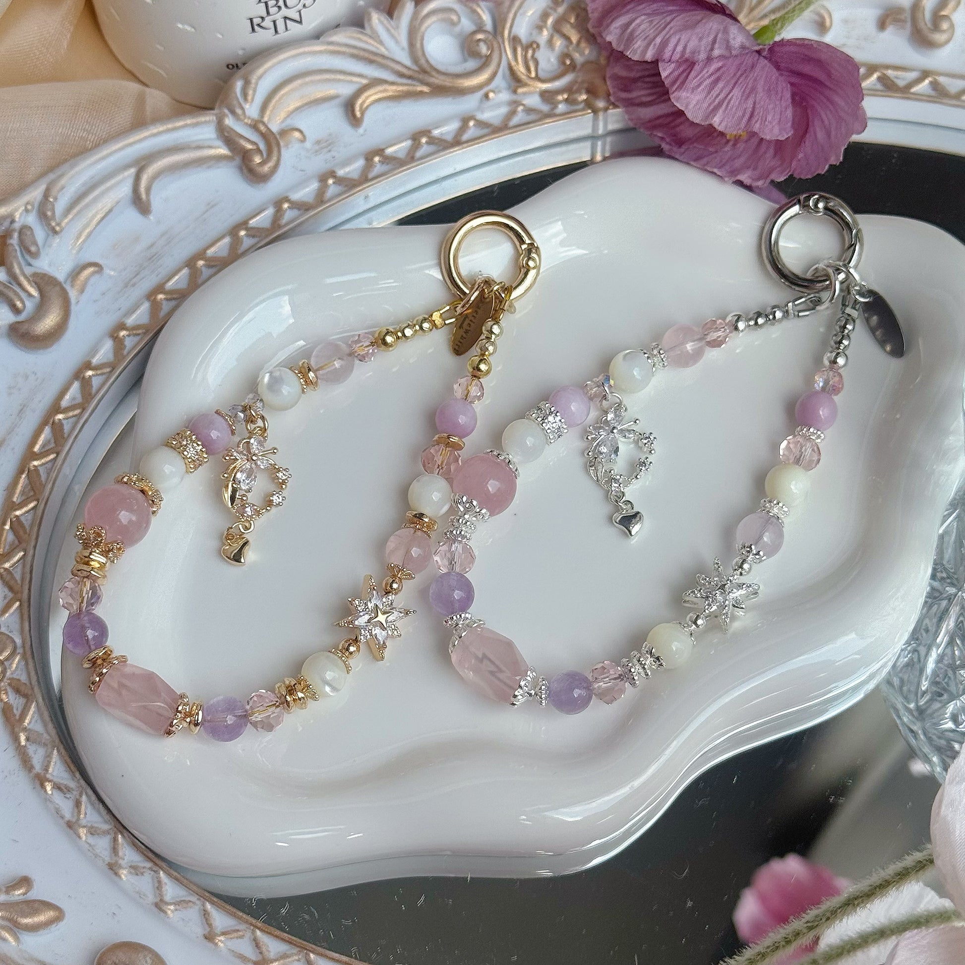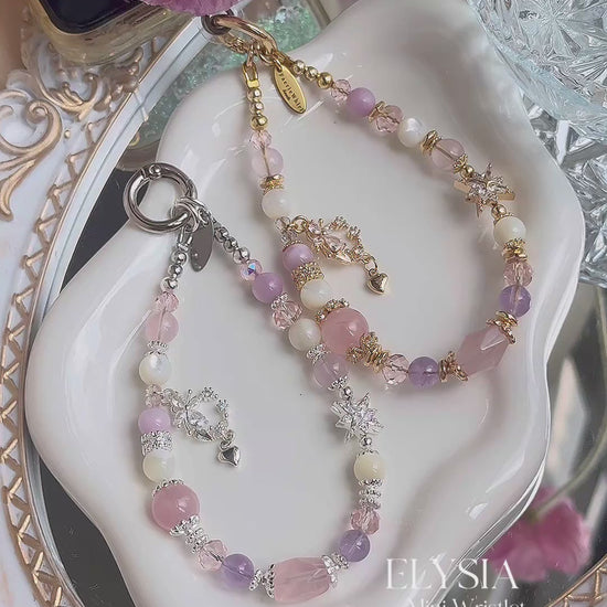 The ELYSIA charm combines soft, sweet hues with delicate sparkle, featuring Rose Quartz, Kunzite, Lavender Amethyst, and White Trochus beads. Choose between elegant gold or silver hardware, accented with a star charm and a unique dangling moon crescent floral heart charm.