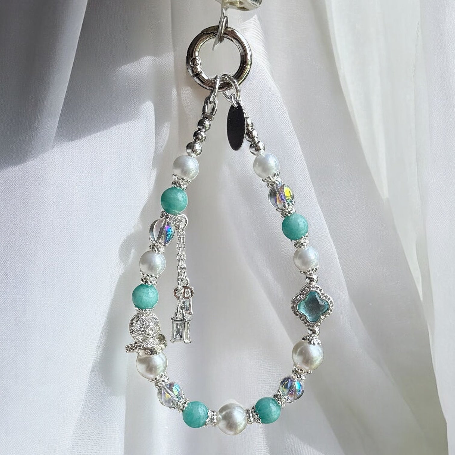 The MIRELLE charm features vibrant Amazonite beads paired with delicate white faux pearls, all accented by silver-plated hardware and a charming clover-shaped charm. The bright, soothing shade of Amazonite is eye-catching yet elegantly balanced by the classic softness of the pearls.
