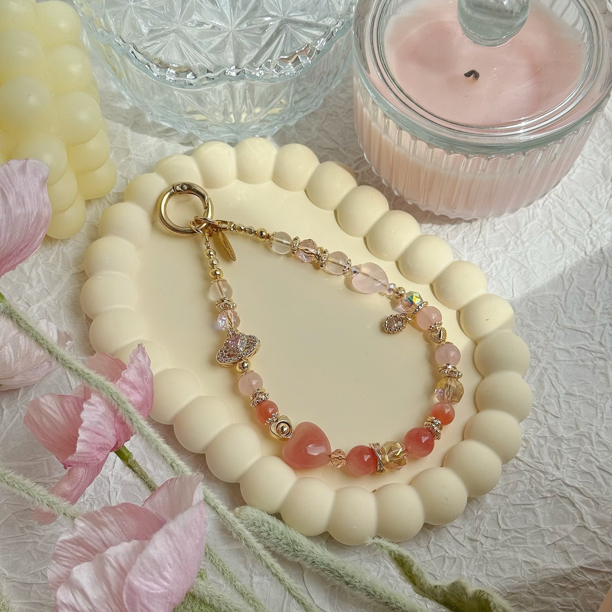 The Amore mini wristlet is a delicate blend of elegance and energy, crafted with Yan Yuan Agate, Starlight Rose Quartz, and Rose Quartz, adorned with 14k gold-plated hardware. At its heart lies a soft peach, heart-shaped Yan Yuan Agate, radiating warmth and love. Designed with an ombre gradient that flows gracefully from gentle peach to rosy pink, this piece embodies harmony and affection in both form and spirit.