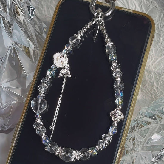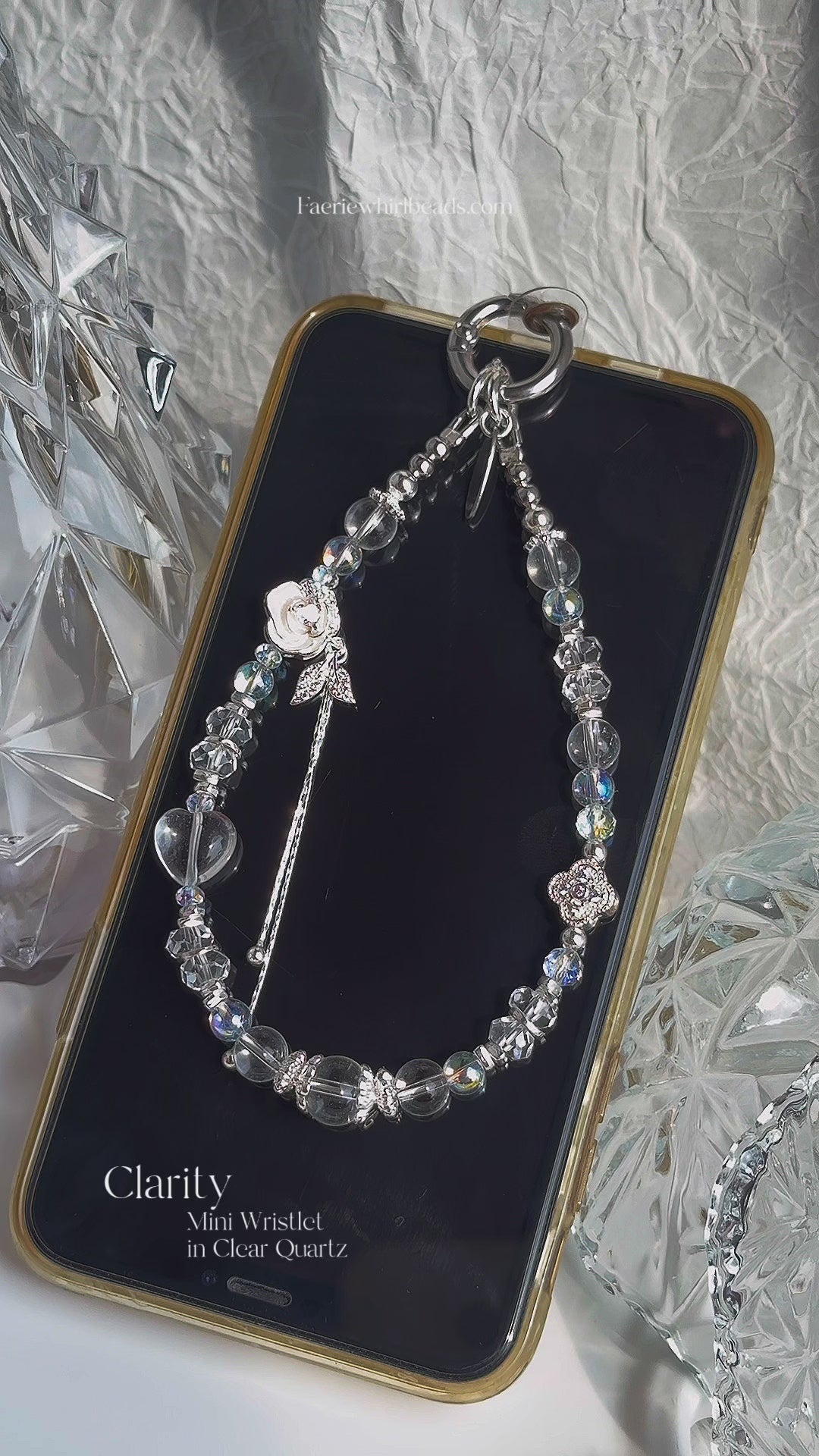 The Clarity mini wristlet features high-quality Clear Quartz in super-clear, round, faceted and heart-shaped forms, paired with silver-plated hardware, a delicate clover charm, and a charming floral tassel dangle. Elegant and radiant, this charm embodies purity, positivity, and energy amplification, making it a perfect companion for daily inspiration and mindfulness.