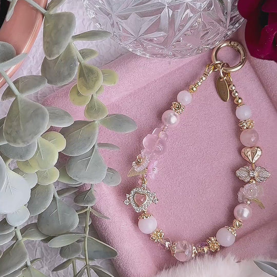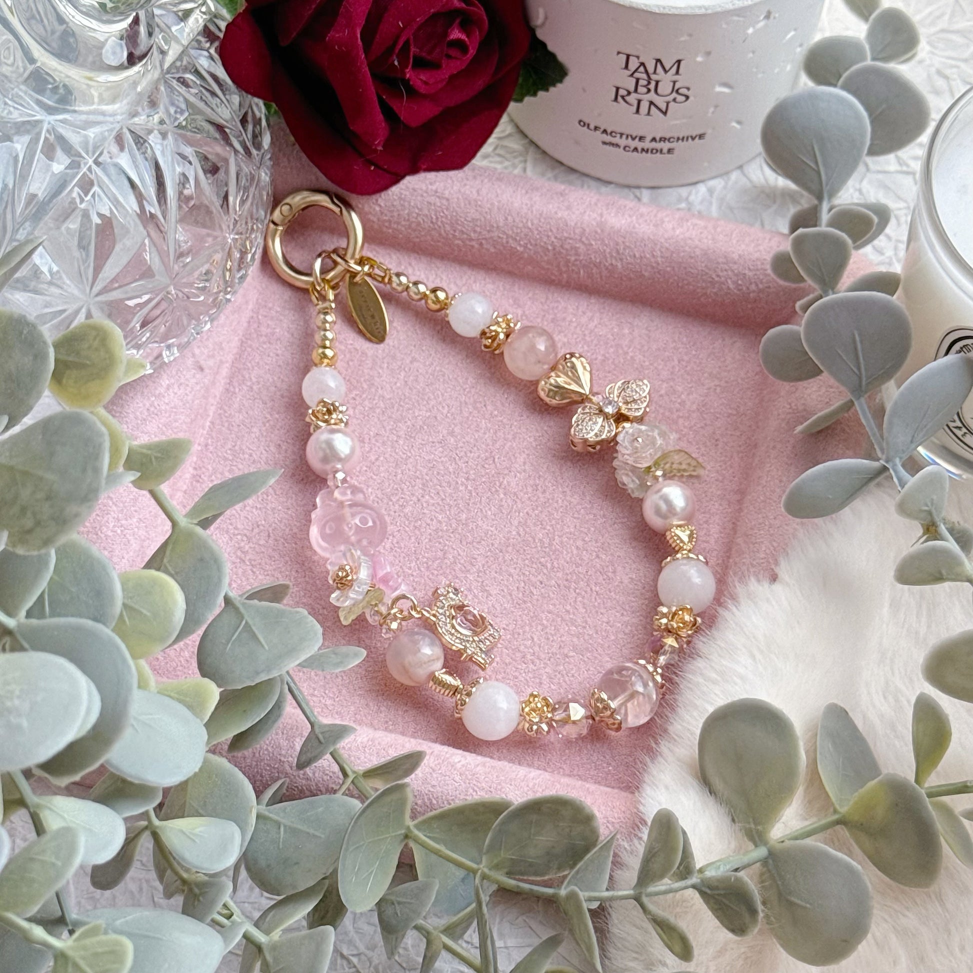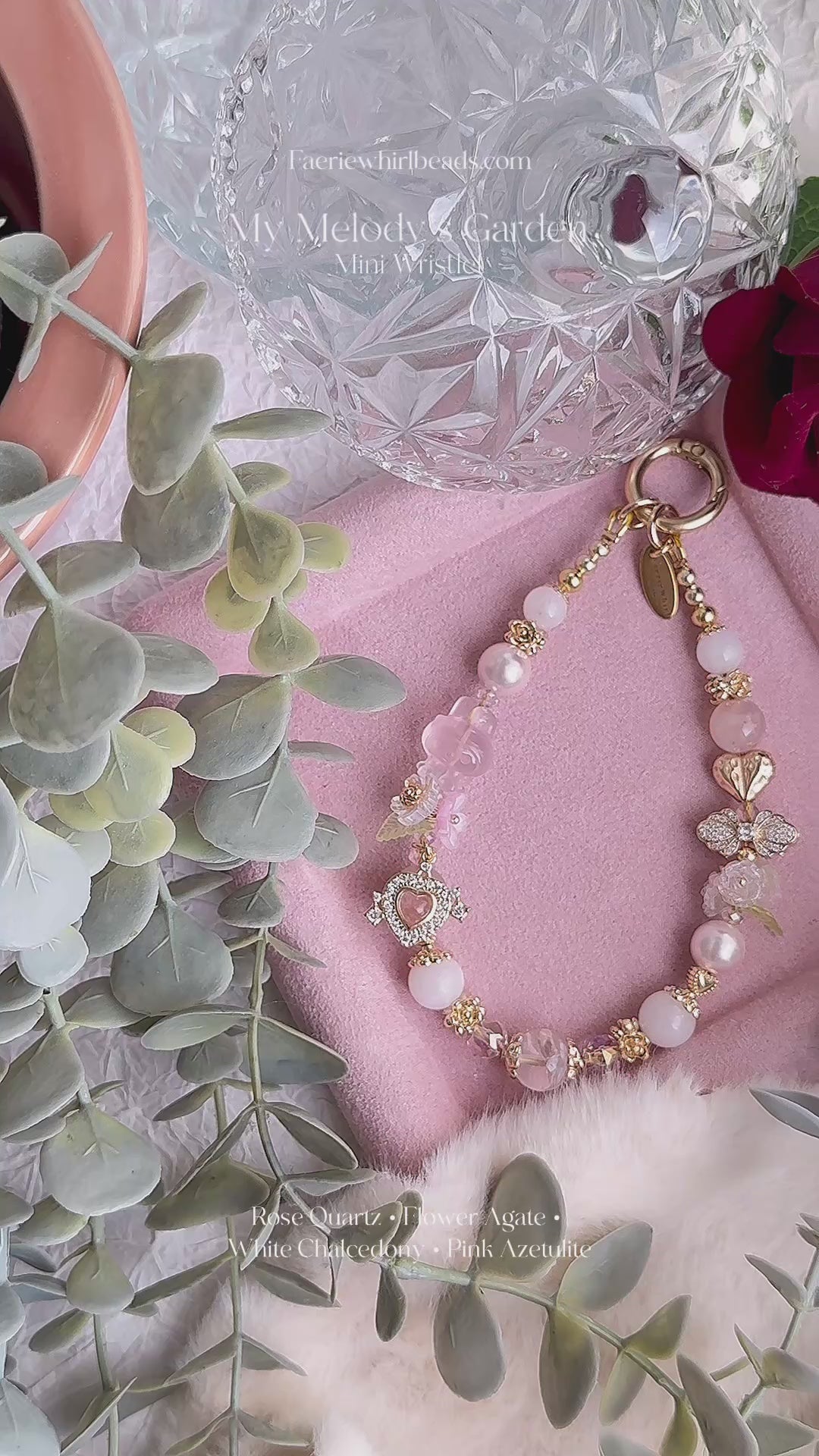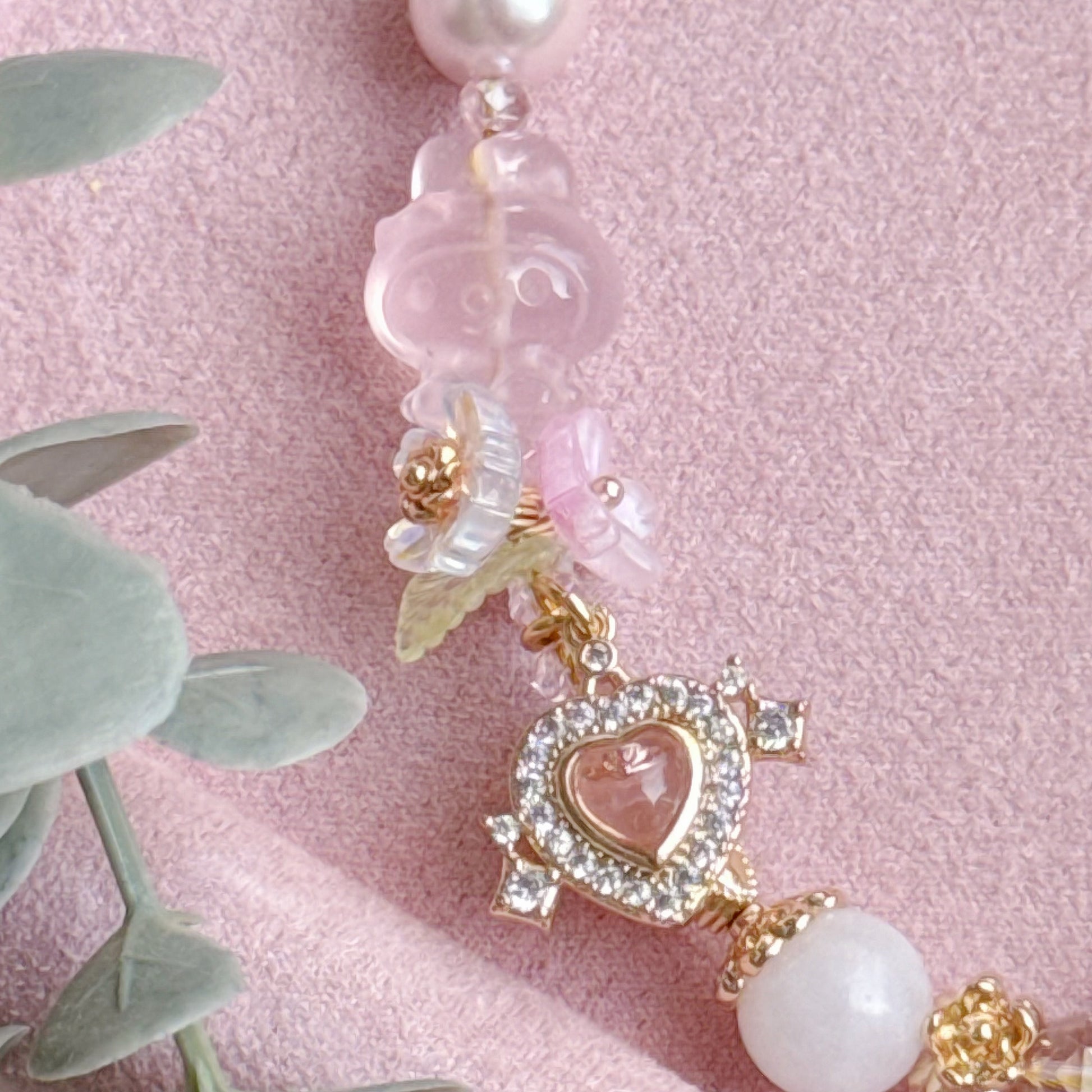 Step into a soft pink dream with My Melody’s Garden, a pastel-inspired charm designed after Sanrio’s sweet My Melody. Centered around a Rose Quartz My Melody crystal, this charm blooms with Flower Agate, Pink Azeztulite, White Chalcedony, delicate flower accents, and 14k gold-plated bow and heart dangles; a gentle garden of love, purity, and serenity.