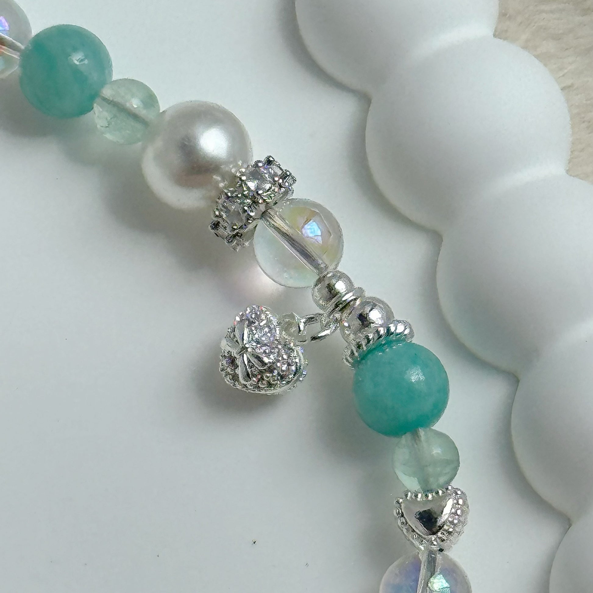 in Amazonite, Green Fluorite, White Faux Pearl & Sliver-plated hardware.