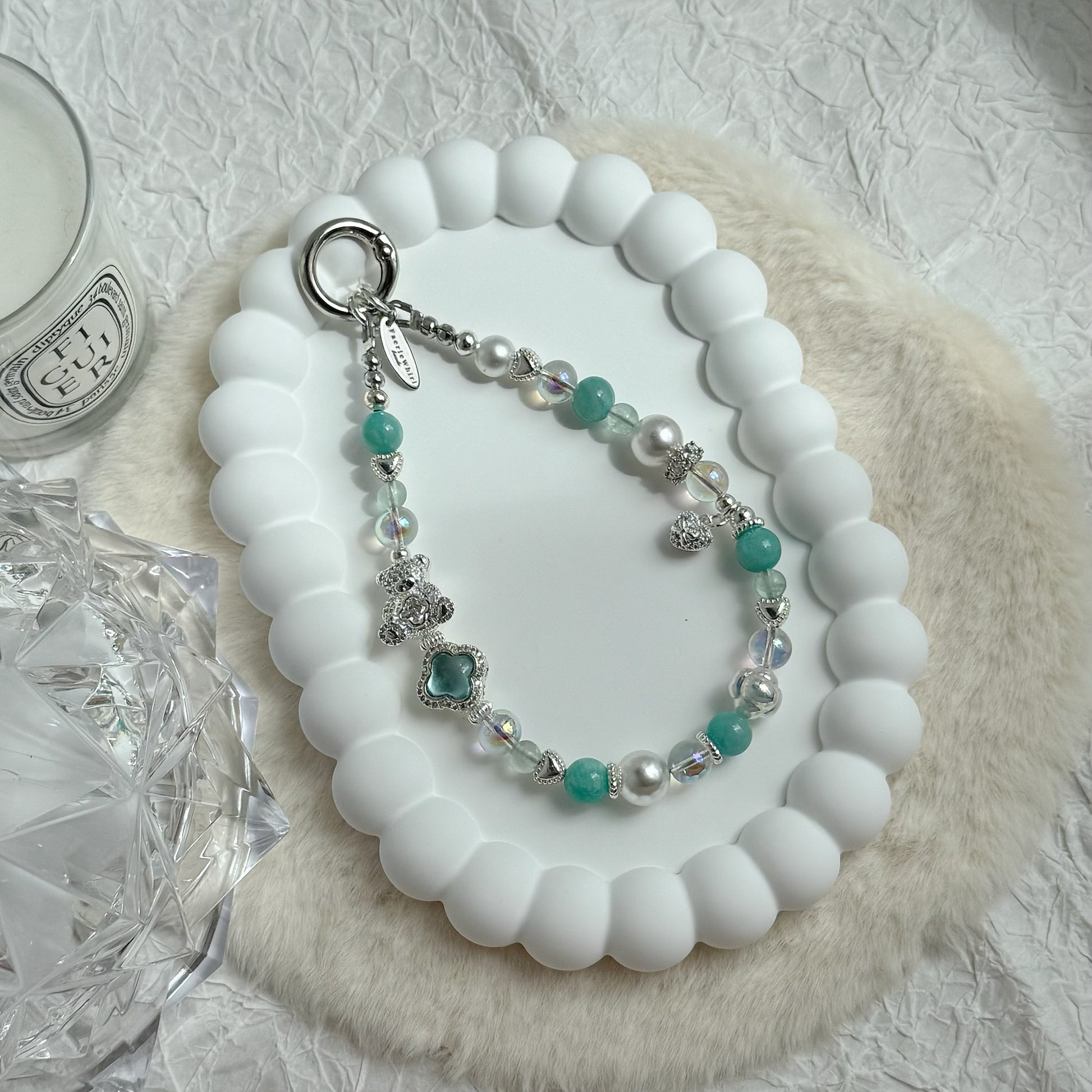 The MIRELLE charm features vibrant Amazonite and soothing Green Fluorite paired with white faux pearls, all accented by silver-plated hardware and a charming clover-shaped charm. The bright, soothing shade of Amazonite is eye-catching yet elegantly balanced by the classic softness of the pearls.