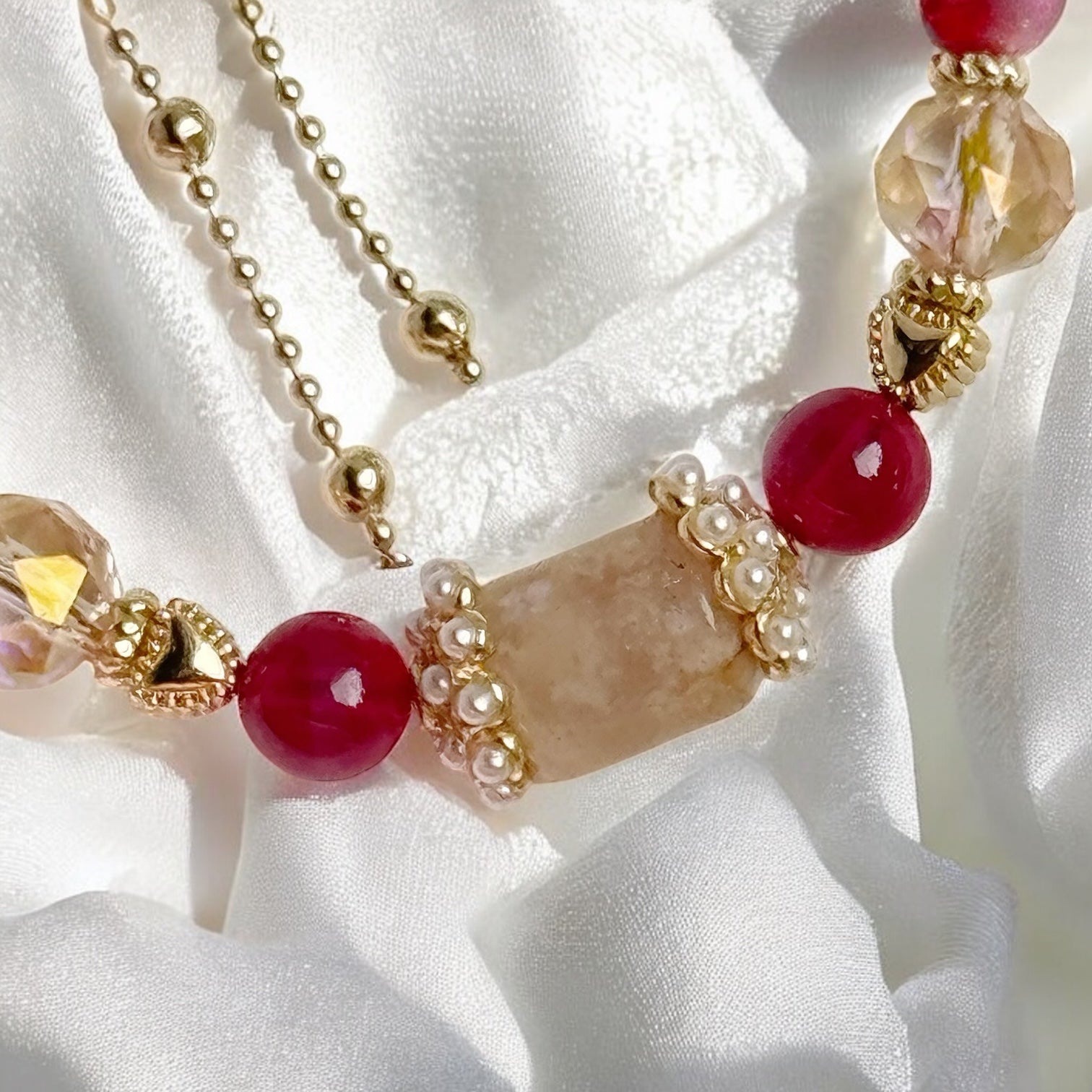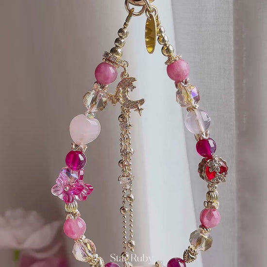 This enchanting crystal mobile mini wristlet is a celebration of love, transformation, and inner strength. Handcrafted with Star Ruby, Flower Agate, Rhodonite, and Rose Quartz, it is elegantly finished with 14k gold-plated hardware and a captivating centerpiece of moon, stars, and butterfly dangling charms — symbols of intuition, hope, and personal rebirth. The Star Ruby reveals a mesmerizing star-like flash when it catches the light, while the harmonious blend of soft pinks and rosy hues creates a radiant, feminine palette that exudes grace and positivity.
