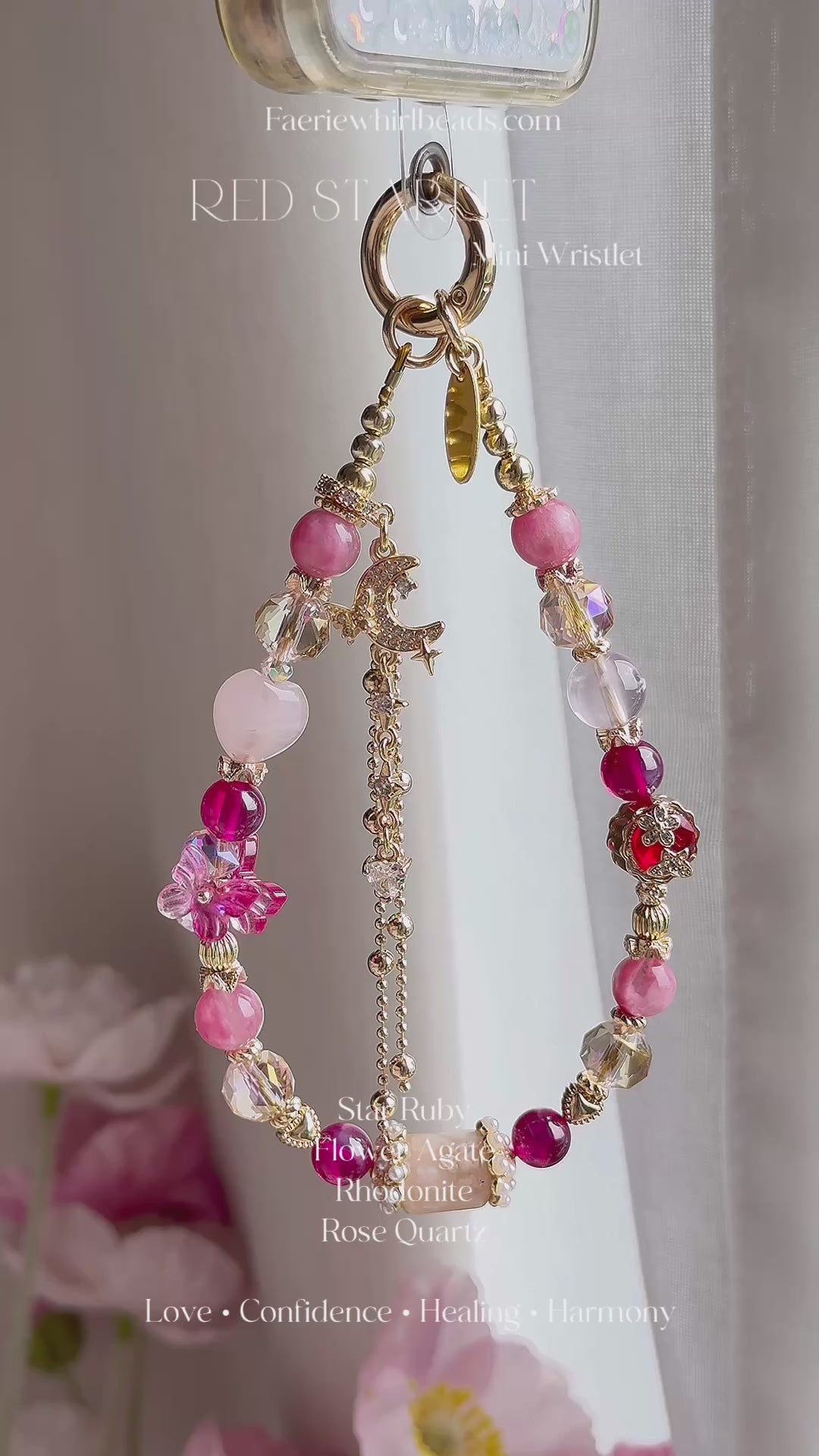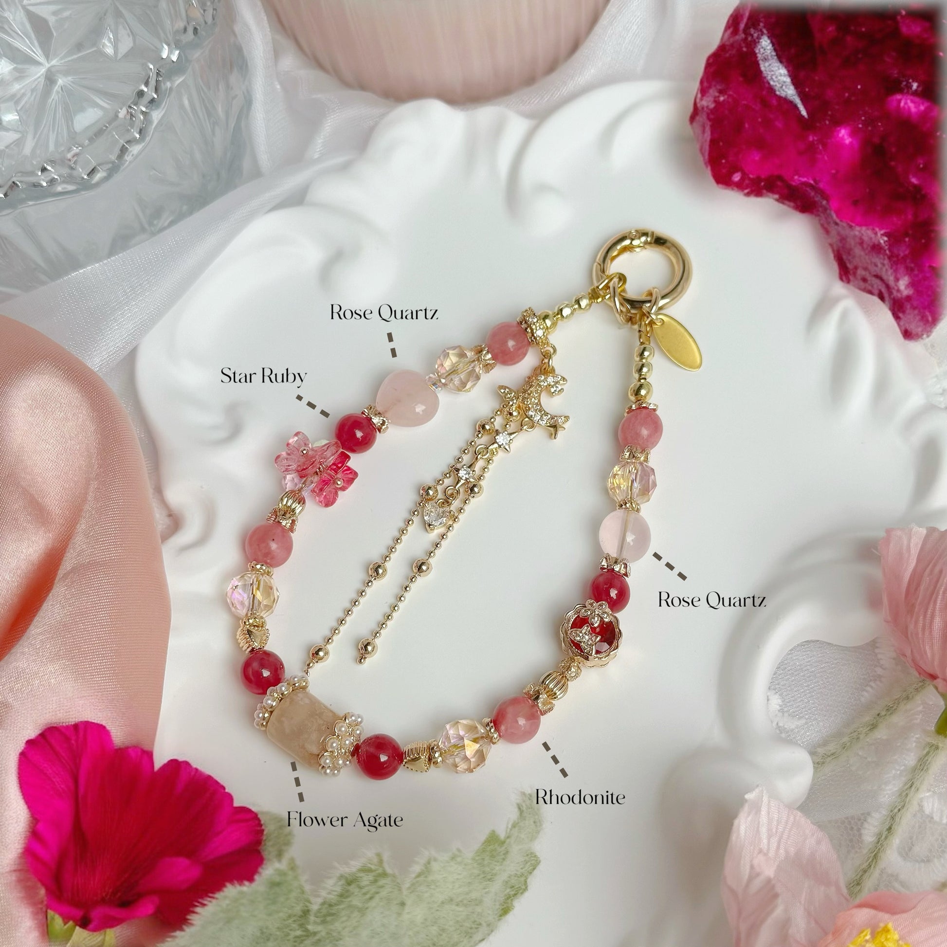 When united, these crystals create a gentle yet powerful synergy that supports emotional healing, confidence, and self-love. Star Ruby energizes and protects, while Flower Agate and Rhodonite cultivate emotional growth and compassion. Rose Quartz amplifies love and tranquility, harmonizing the ensemble. The addition of the moon, stars, and butterfly charms enhances this energy, representing emotional renewal, inner light, and transformation, making this wristlet a meaningful talisman for balance, beauty, and heartfelt empowerment.