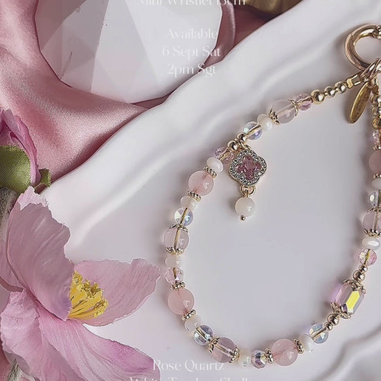 Delicate, dreamy, and full of charm — Sweet Airi is a dainty crystal mobile charm handcrafted with soft Pink Rose Quartz, luminous Clear Rose Quartz, and shimmering White Trochus Shell in elegant abacus beads. Adorned with iridescent acrylic accents and 14k gold-plated hardware, it features a graceful clover charm studded with a pink zircon, a subtle touch of luck and sparkle.