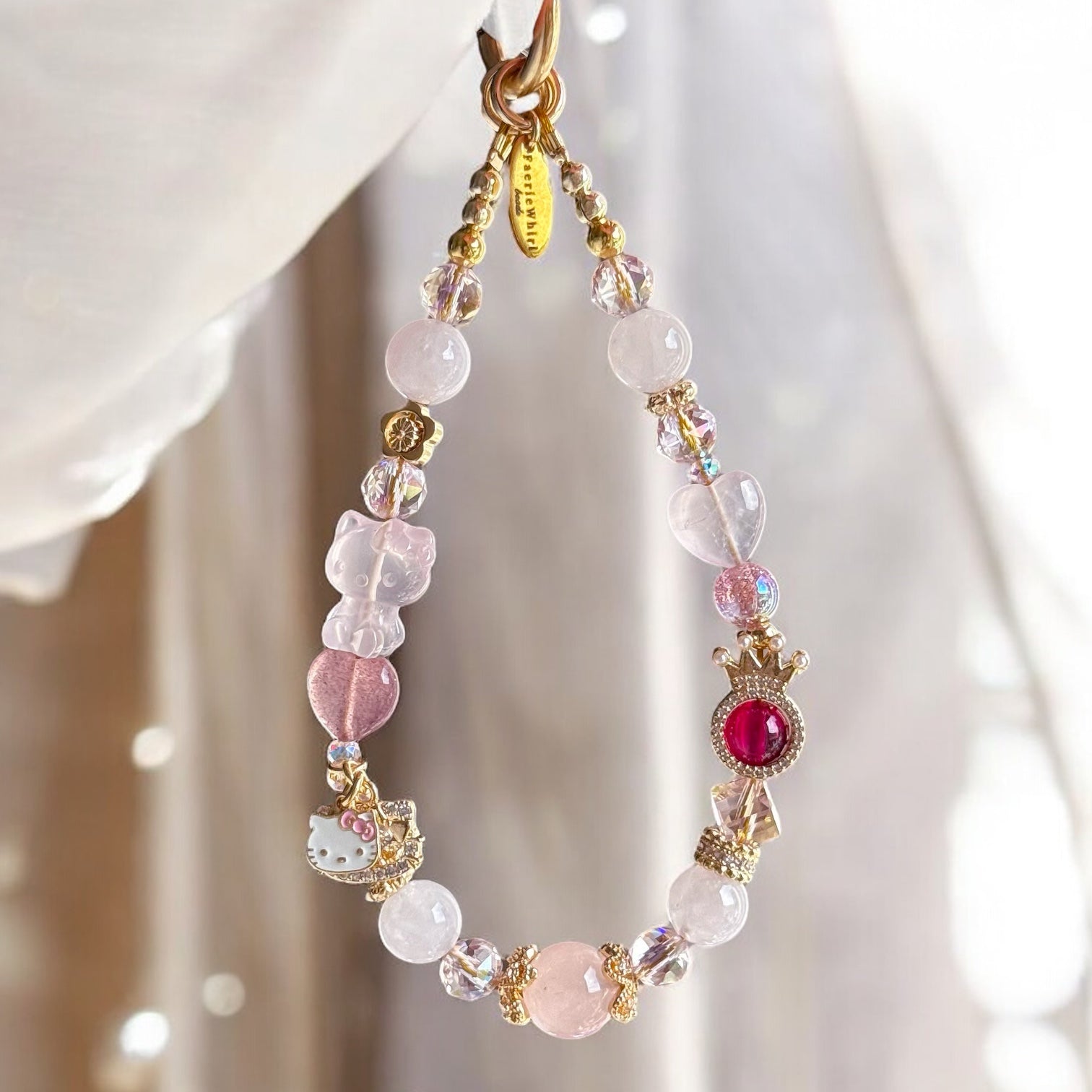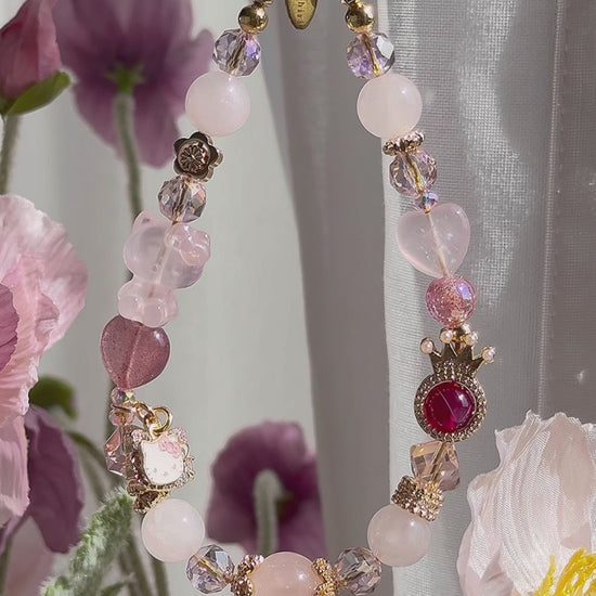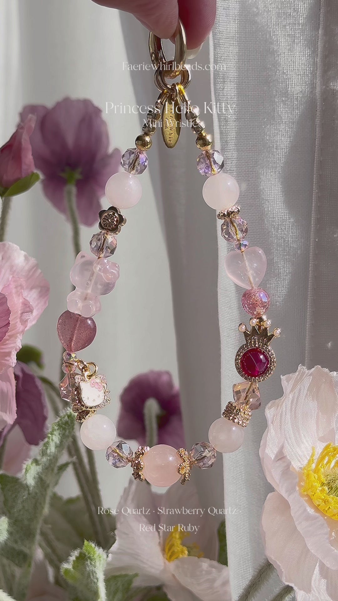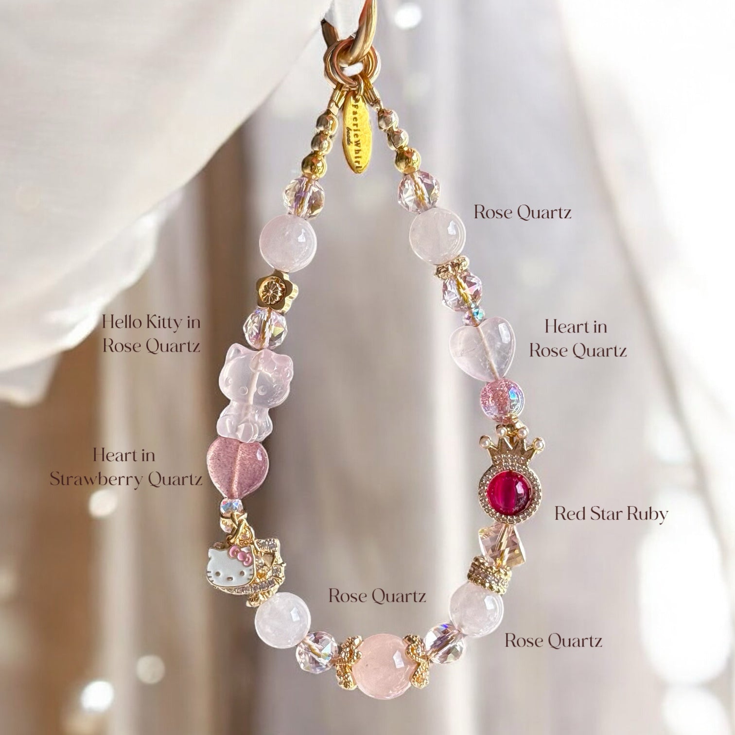 Inspired by Sanrio’s beloved Hello Kitty, this mini wristlet features a royal blend of Rose Quartz, Strawberry Quartz, and Red Star Ruby, adorned with 14k gold-plated crown charms and Hello Kitty dangles for a truly princess-perfect touch.