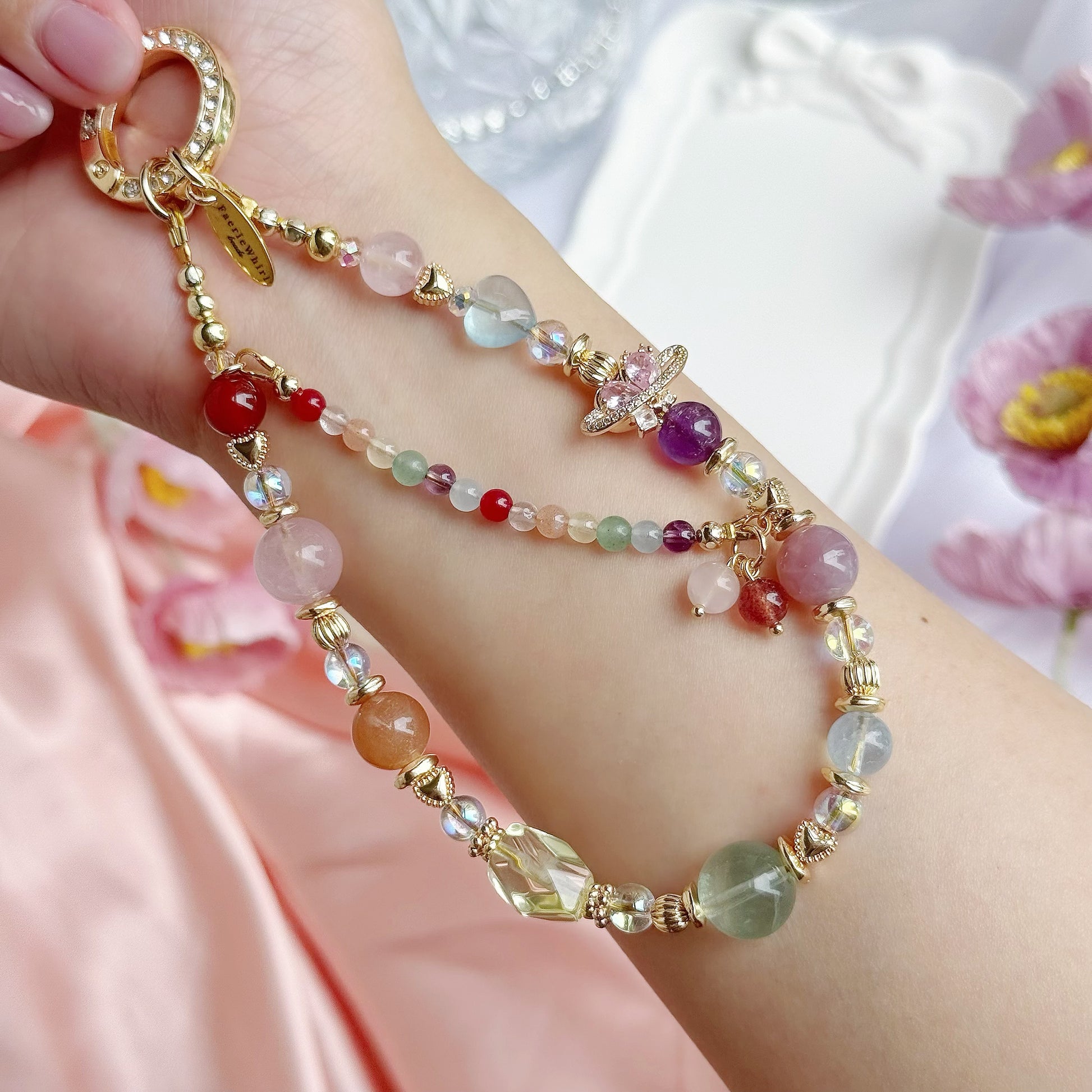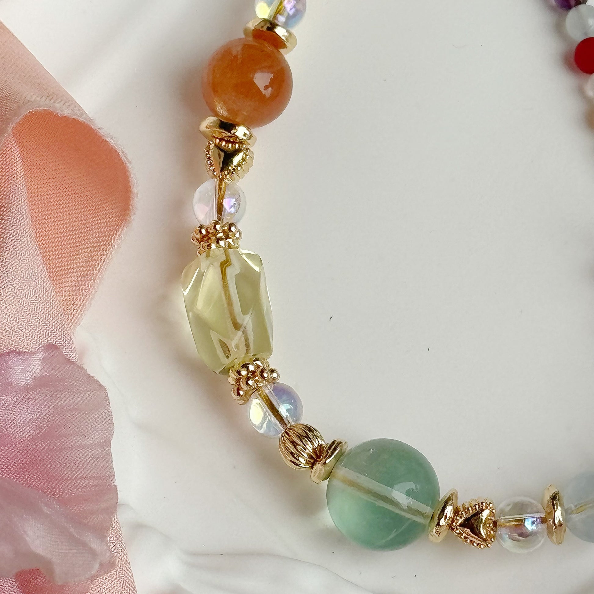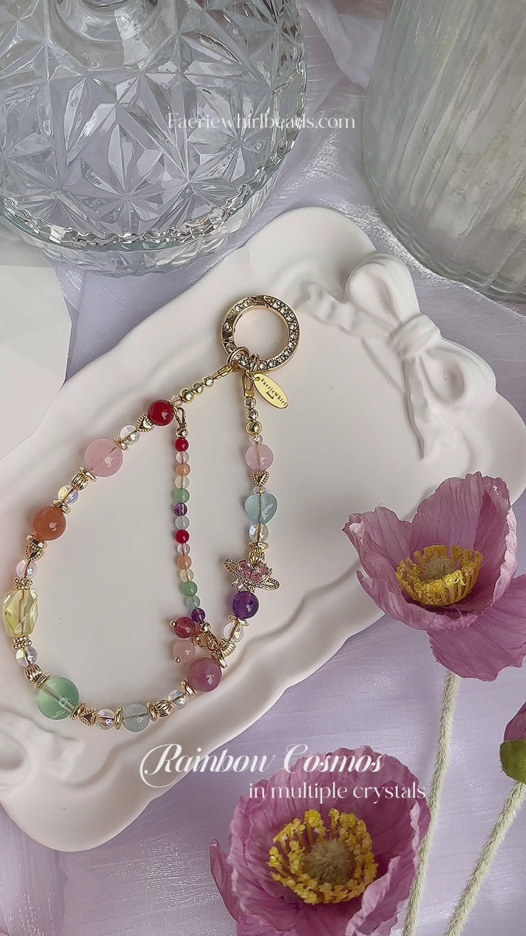 Together, these crystals create a harmonious blend of energies: Carnelian and Sunstone ignite passion and joy, Rose Quartz and Lavender Rose Quartz nurture love and emotional healing, Citrine and Lemon Citrine invite abundance and positivity, Green Fluorite and Aventurine promote balance and growth, Clear Aquamarine soothes and clarifies, Uruguay Amethyst calms the mind, and Strawberry Quartz brings gentle heart-centered energy. This vibrant combination supports emotional well-being, vitality, and spiritual connection, making Rainbow Cosmos a radiant charm for everyday empowerment and joyful expression.