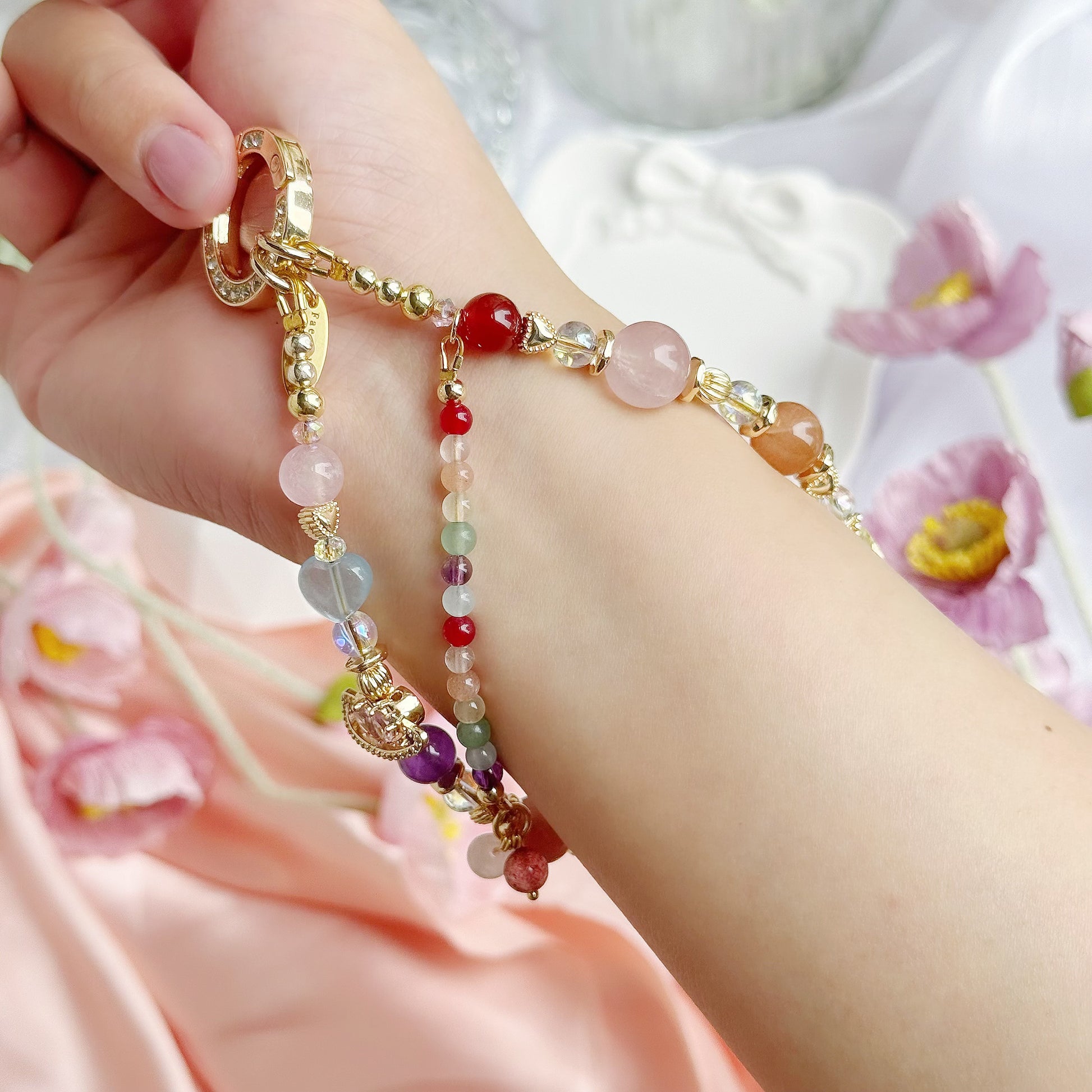 Bursting with vibrant energy and cosmic beauty, the Rainbow Cosmos charm features a stunning array of rainbow-colored crystals including Carnelian, Rose Quartz, Sunstone, Lemon Citrine, Green Fluorite, Clear Aquamarine, Lavender Rose Quartz, Uruguay Amethyst, Green Aventurine, and Strawberry Quartz—in unique, assorted shapes. The centerpiece is a radiant pink heart zircon cosmo charm, complemented by a delicate connecting chain adorned with multicolored rainbow crystals without compromising comfort, fitting perfectly around the wrist.