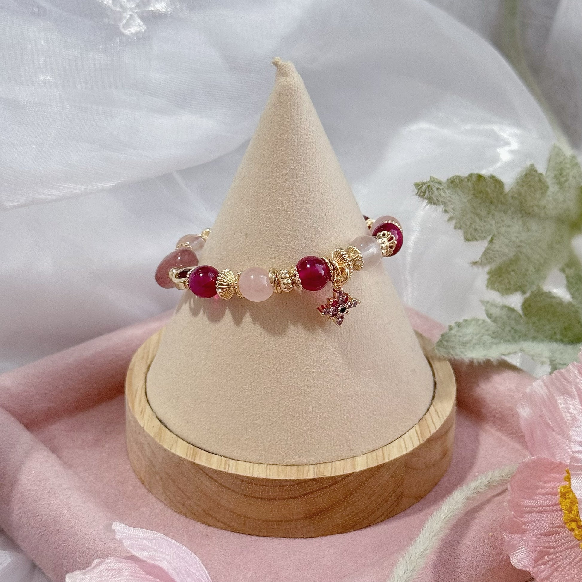 RYLEE Bracelet features a luxurious blend of Star Ruby, Rose Quartz, Strawberry Quartz, and Garnet, paired with elegant 14k gold-plated hardware. Sparkling zircon charms and star dangle add a touch of brilliance, but the true highlights are the vibrant Star Ruby at and a heart-shaped Strawberry Quartz that brings soft, romantic charm. The combination of deep reds and gentle pinks creates a piece full of warmth, passion, and emotional radiance.
