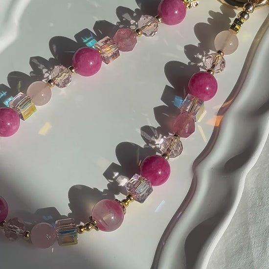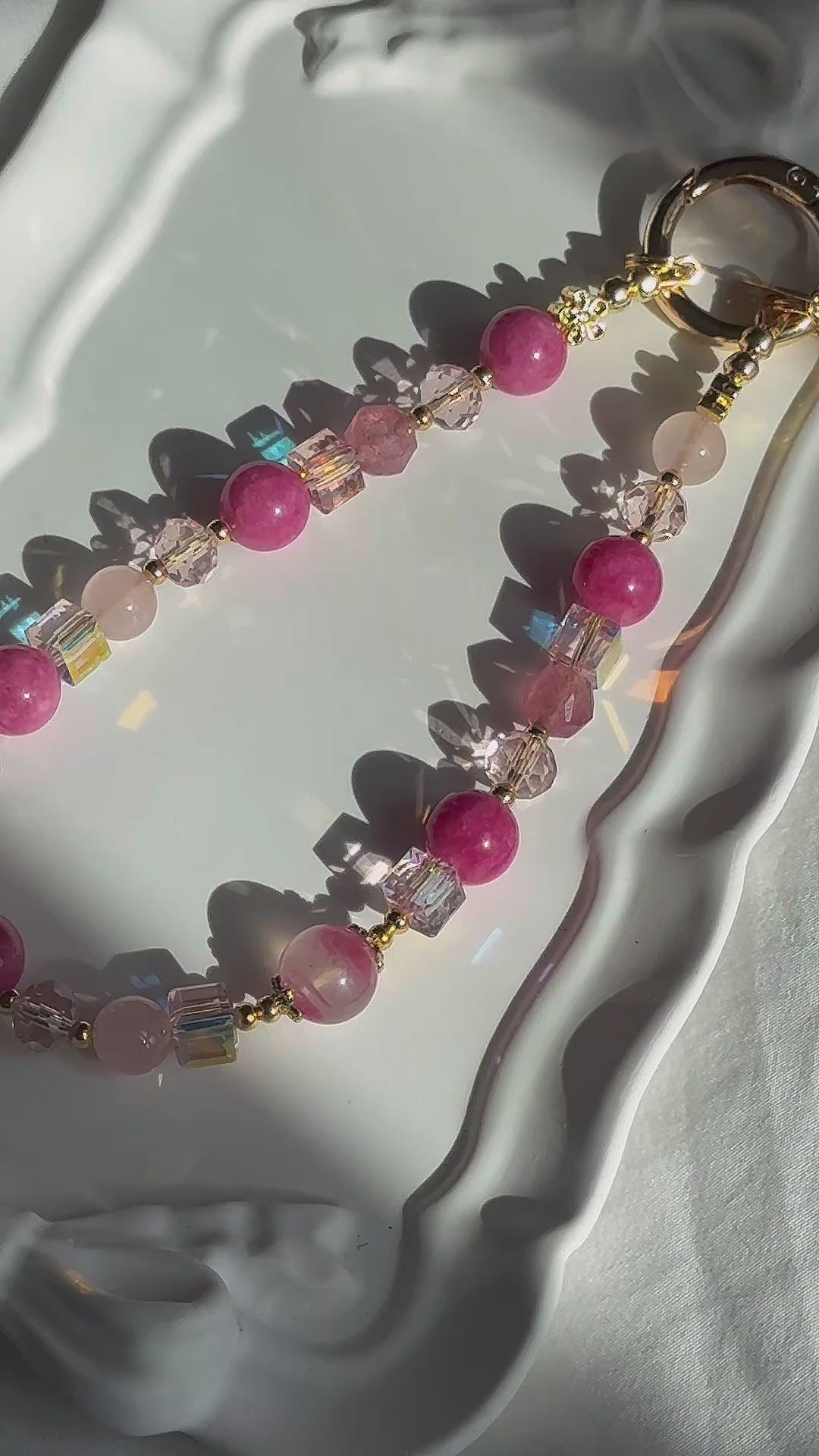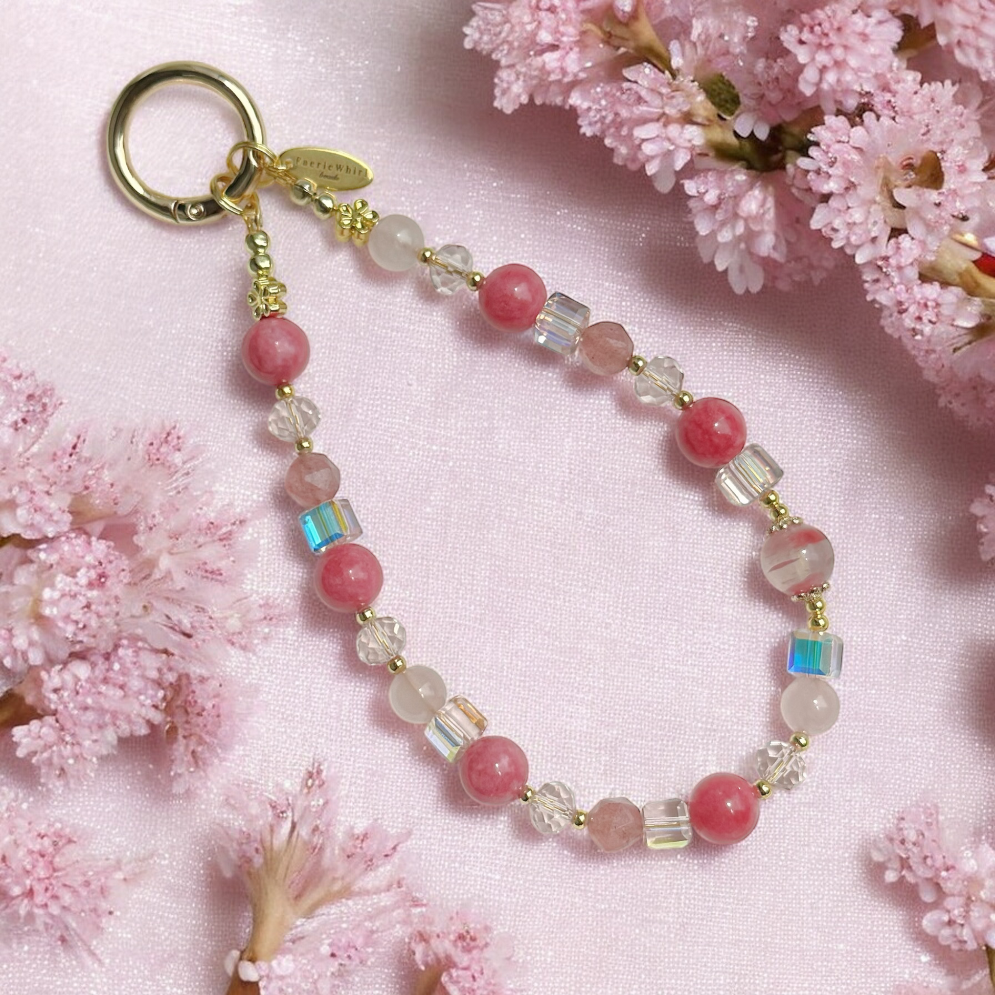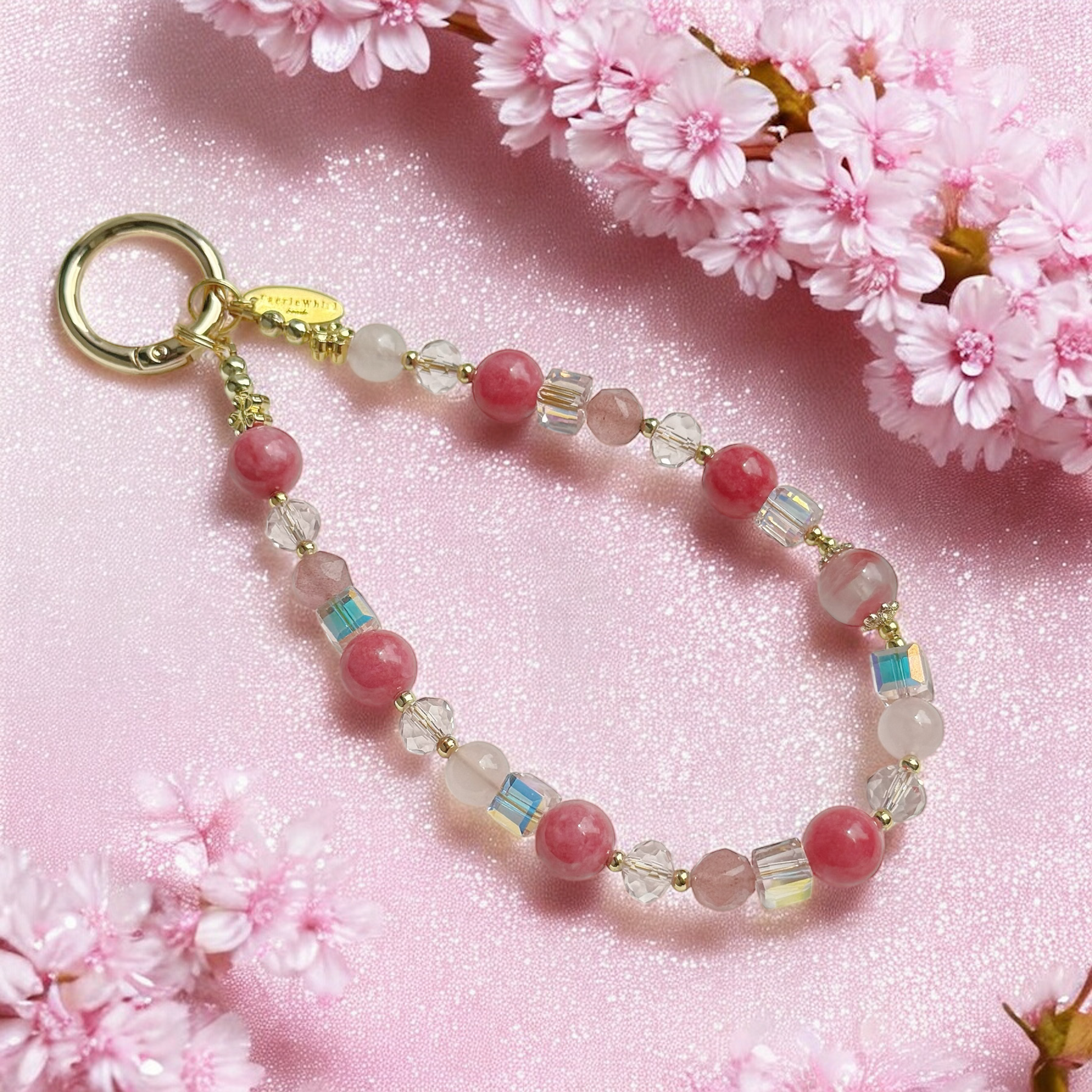 This stunning crystal phone charm features a beautiful blend of Rhodonite in vibrant pink, Rose Quartz, faceted Strawberry Quartz, and a soft Sakura Rhodonite centerpiece. The charm is elegantly highlighted with 18k gold-plated hardware, adding a touch of luxury. Accented with iridescent pink rondelle and cube acrylic crystals, it glows with a gentle, radiant sparkle. The combination of these crystals works in harmony to promote emotional healing, love, and compassion. Rhodonite and Sakura Rhodonite encourage forgiveness and emotional balance, while Rose Quartz fosters unconditional love and self-acceptance. Strawberry Quartz amplifies joy, positivity, and nurturing energy. Together, these crystals support deep emotional healing, foster inner peace, and enhance self-love, making this charm the perfect companion for emotional well-being and harmonious relationships.